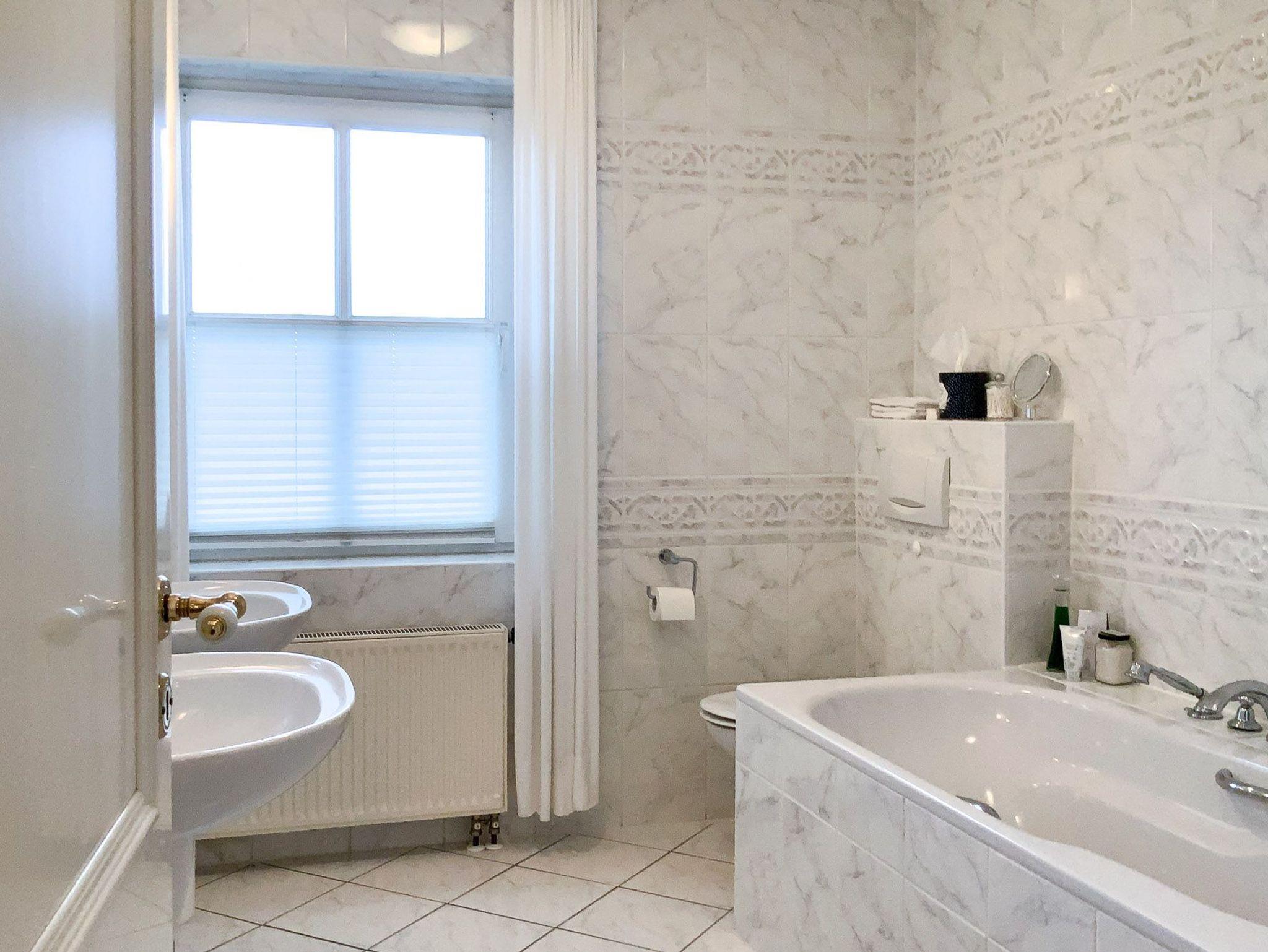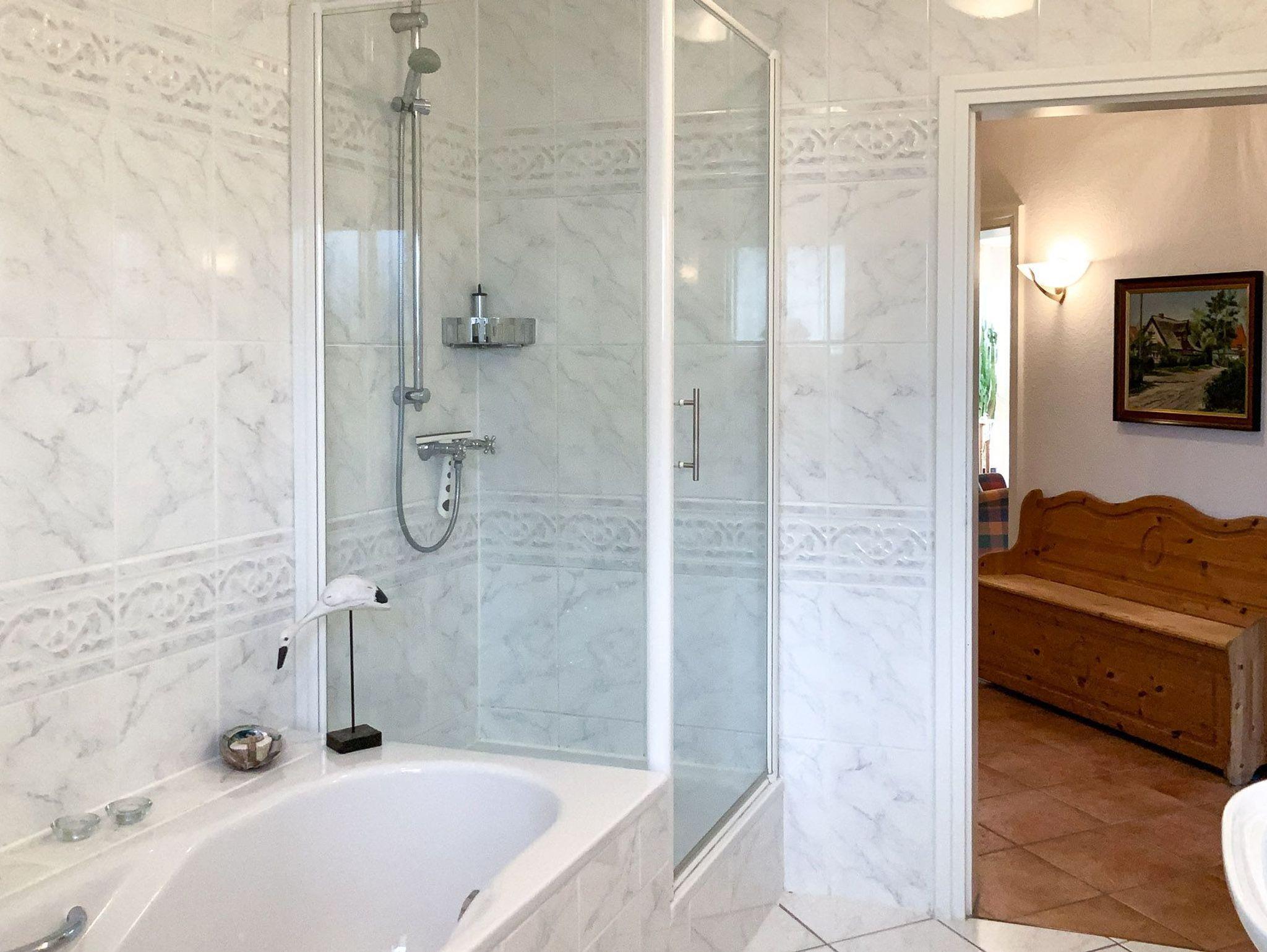 • Modernes Badezimmer mit Badewanne, Dusche und WC