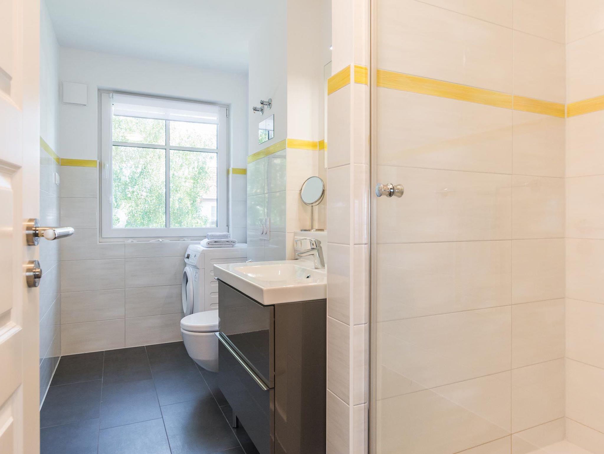 Das modern eingerichtete Badezimmer ist mit einer hochwertigen Dusche sowie einer Waschmaschine ausgestattet.