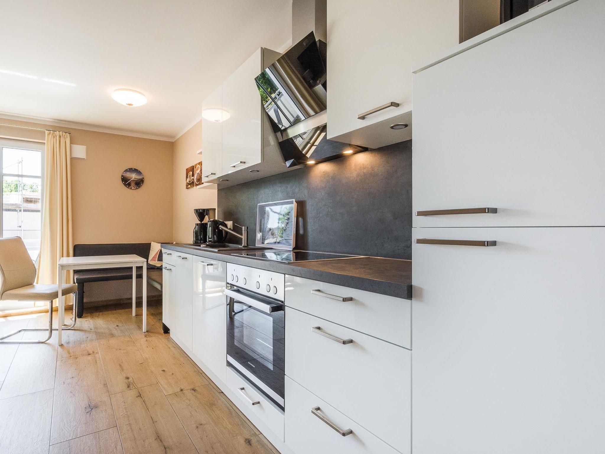 Das Appartement verfügt über einen lichtdurchfluteten Wohnbereich mit einer offenen Küche und gemütlichem Essbereich. Die Küche ist voll ausgestattet.