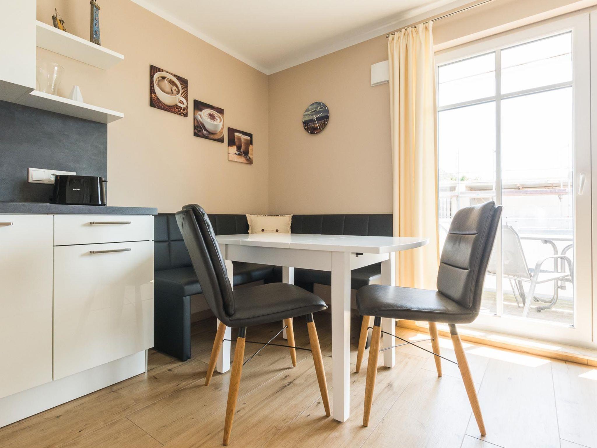 Das Appartement verfügt über einen lichtdurchfluteten Wohnbereich mit einer offenen Küche und gemütlichem Essbereich. Die Küche ist voll ausgestattet.