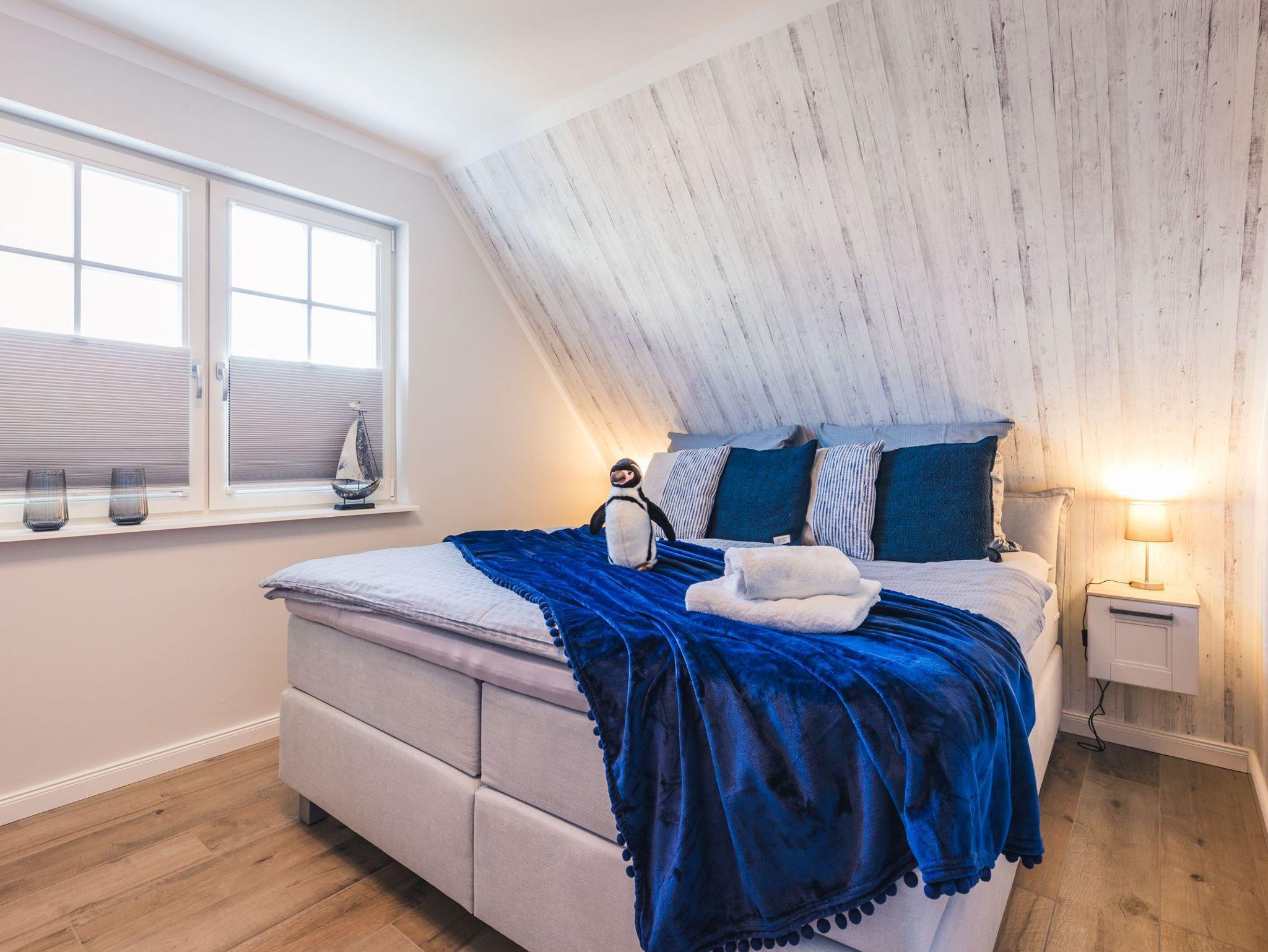 Im Obergeschoss befinden sich zwei Schlafzimmer für je zwei Personen. Die Schlafzimmer sind mit Boxspringbetten und Kleiderschank ausgestattet. Der ausgebaute Spitzboden verfügt über zwei weitere Einzelbetten. Alle Schlafzimmerverfügen über einen Flatscreen Smart TV.