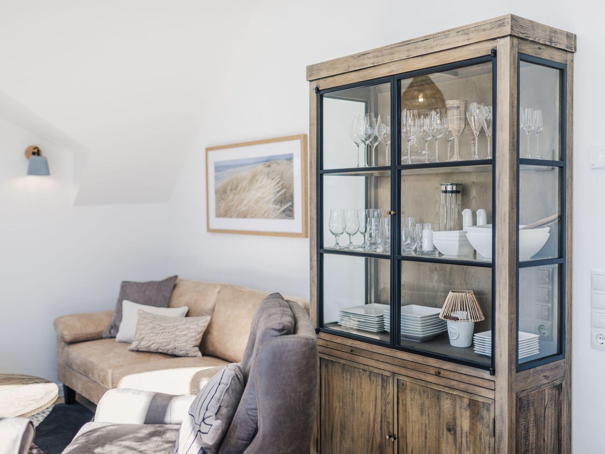 Die Wohnung ist sehr hell und hochwertig eingerichtet und besticht durch viel Liebe zum Detail und zum Meer. Das Herzstück der MeerLiebe ist der große und gemütliche Wohn-/ Essbereich mit offen gestalteter Küche mit einer Raumhöhe von bis zu 5 Metern.