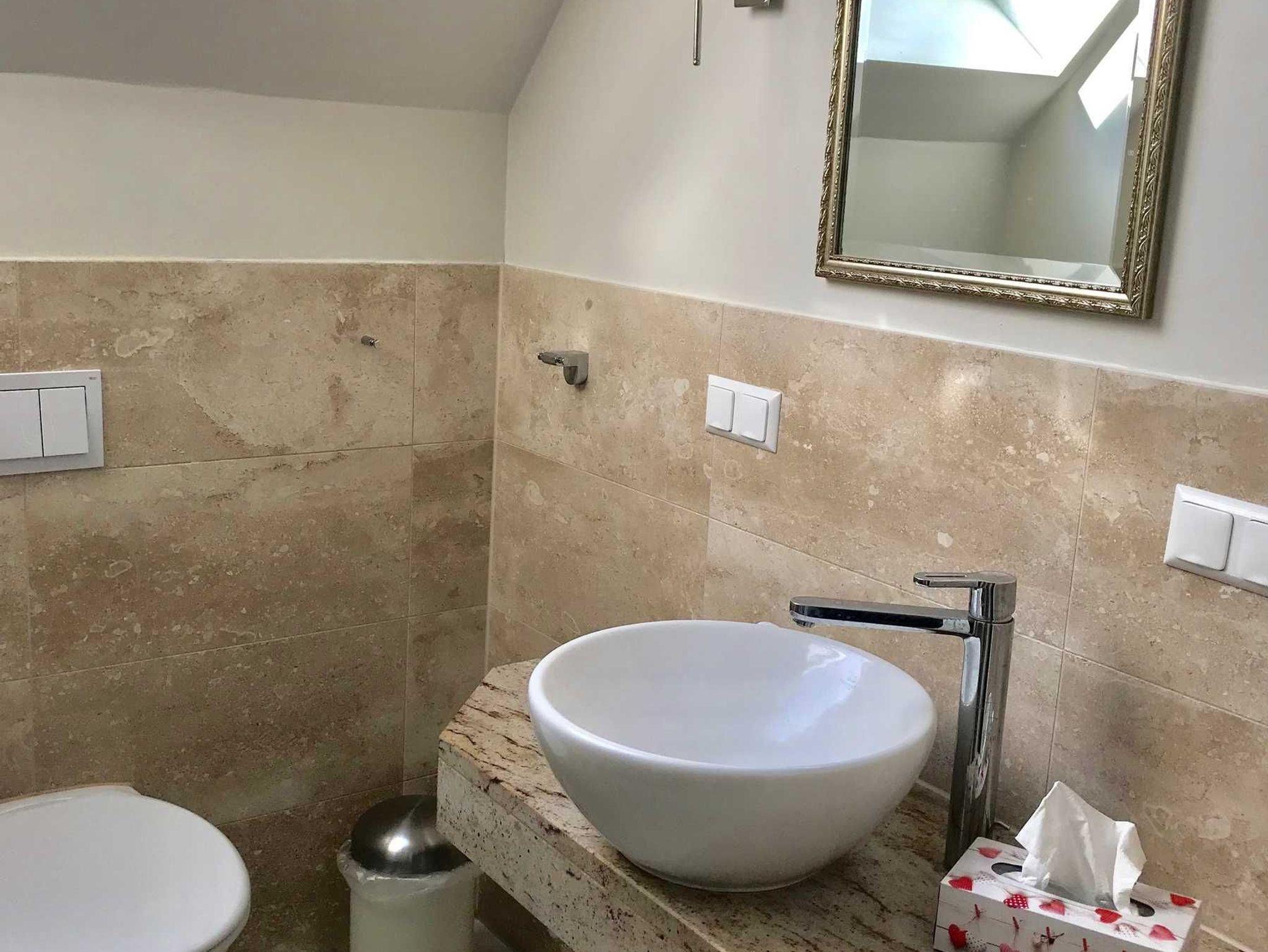 Starten Sie in Ihren Urlaubstag im modernen Bad mit Fenster und bodentiefer Dusche gut erfrischt.