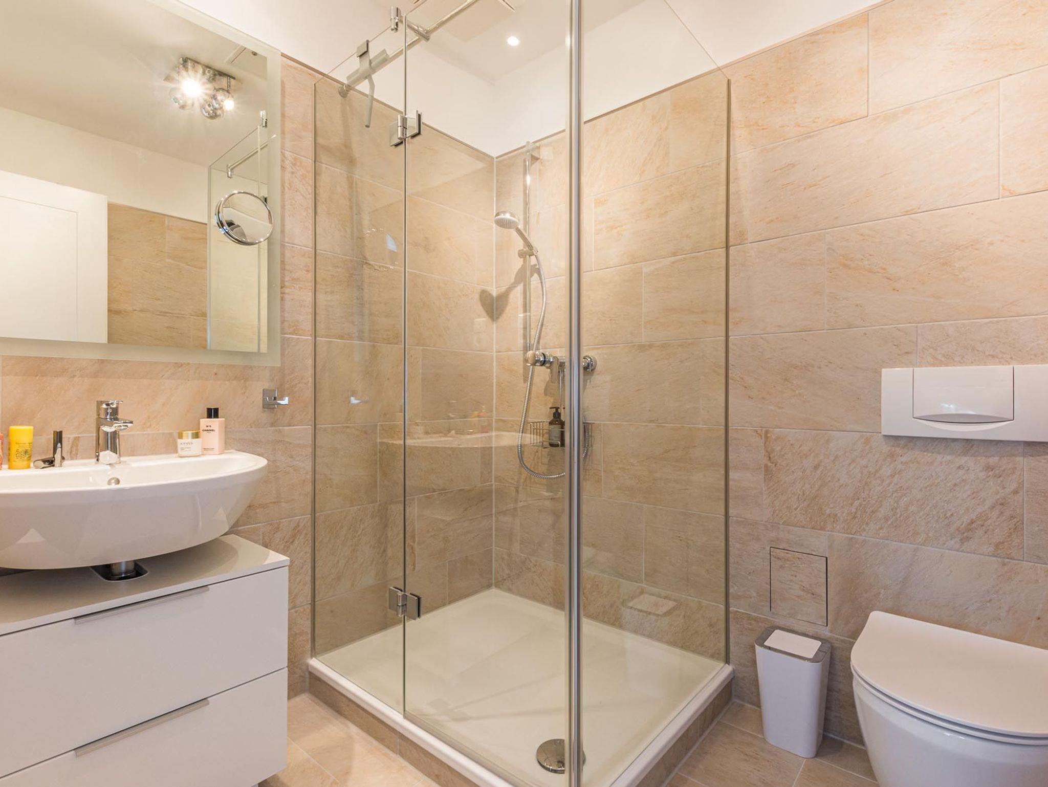 Das modern eingerichtete Badezimmer ist mit einer hochwertigen Dusche ausgestattet.