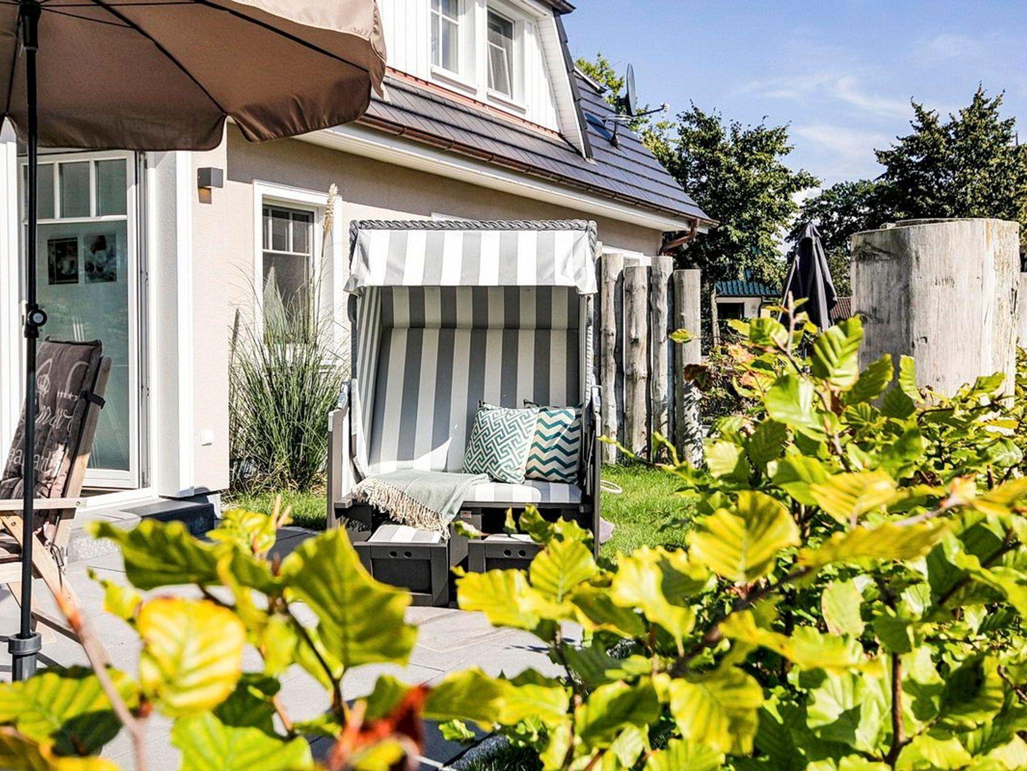 Die Terrasse mit eigenem Strandkorb bietet sonnige Ruheplätze, während der Garten Raum für Entspannung und gemeinsame Momente schafft.