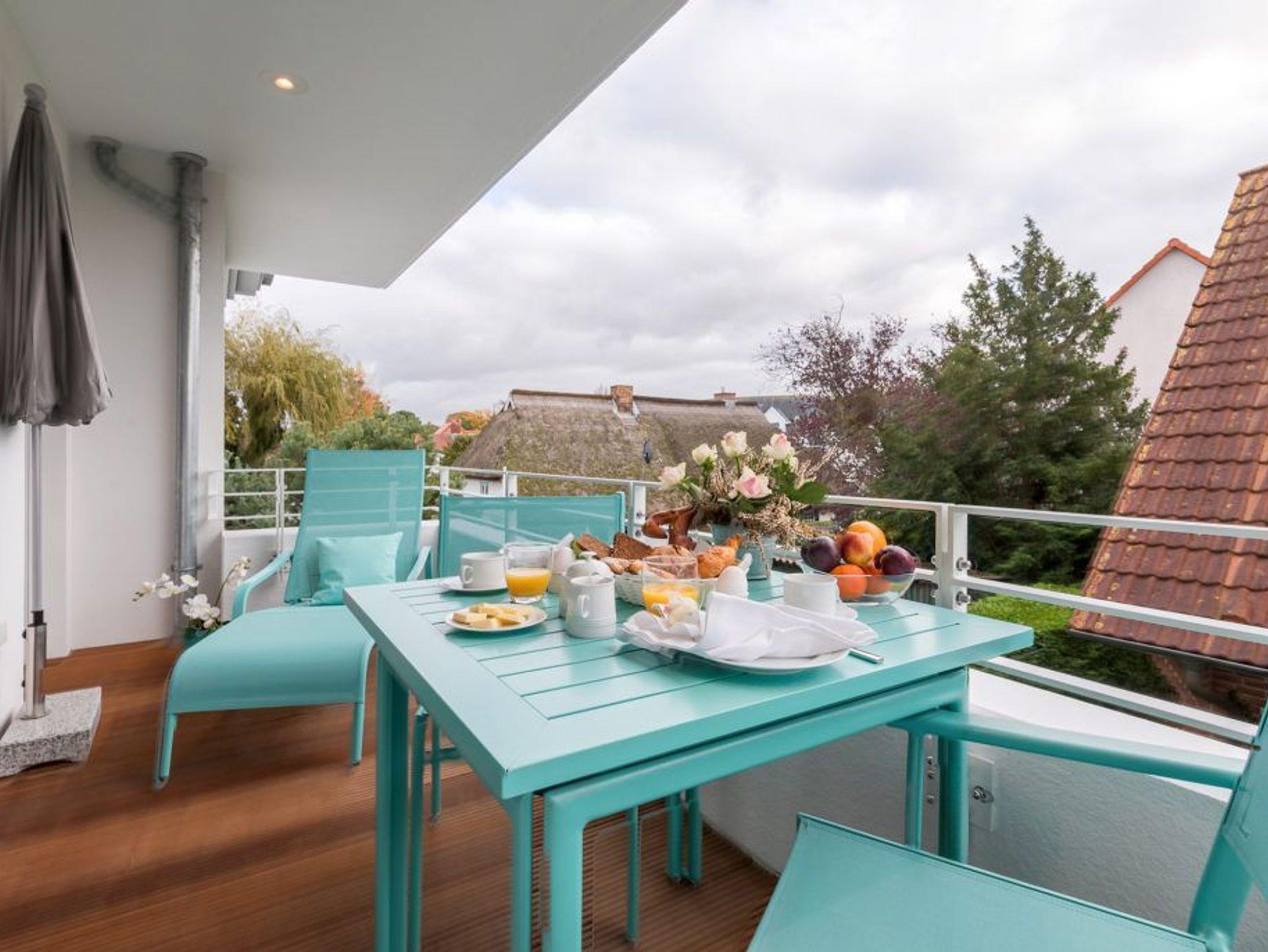• Balkon: Sonniger Südbalkon mit Designer-Möbeln, ideal zum Entspannen und Genießen der frischen Ostseeluft.