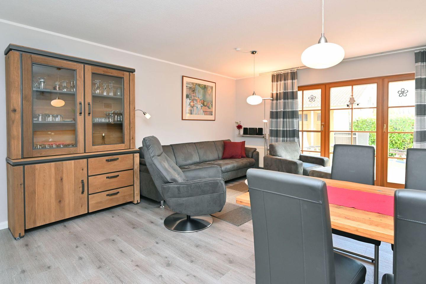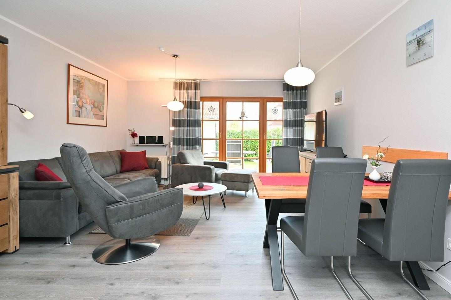 Das einladende Wohnzimmer verfügt über eine bequeme Sitzgruppe, einen Fernseher mit DVD-Player sowie eine Stereo-Musikanlage. Der Esstisch bietet ausreichend Platz für vier Personen – ideal für gemeinsame Mahlzeiten oder gesellige Abende.