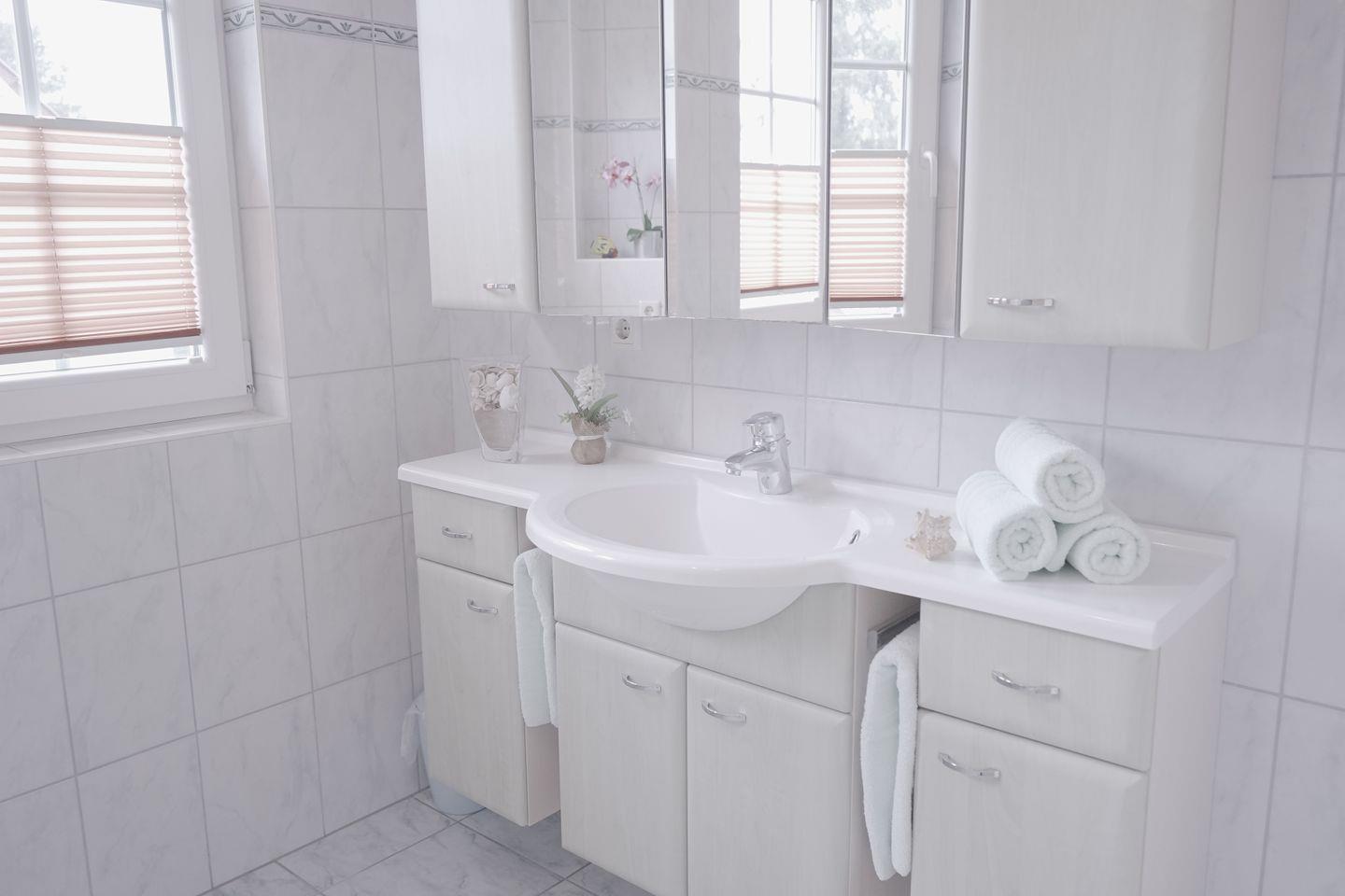 Das Badezimmer verfügt über eine ebenerdige Dusche, die Waschmaschine ist ebenfalls hier zu finden.