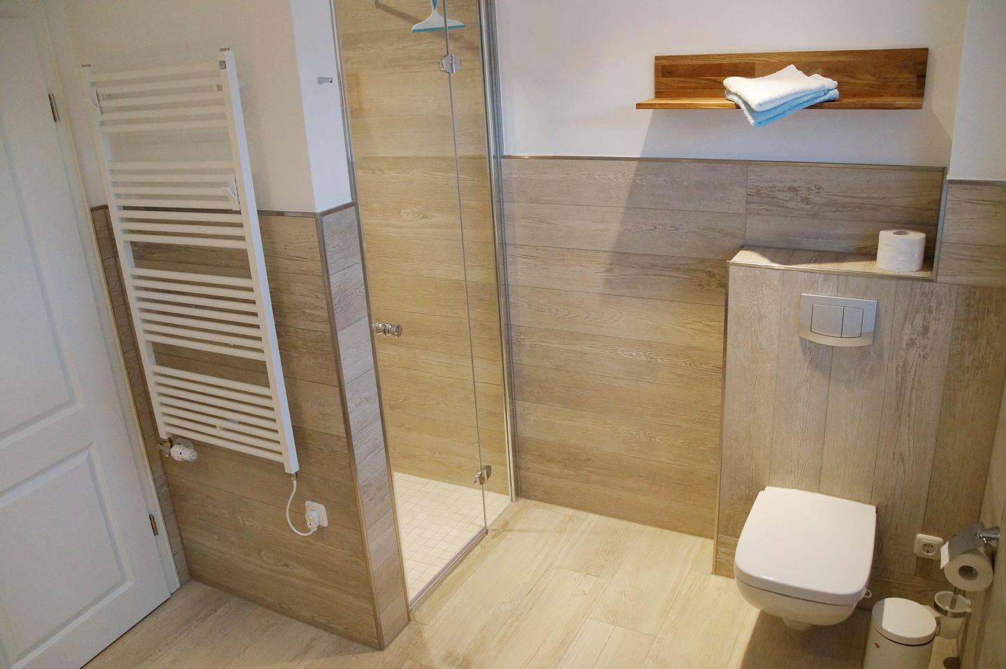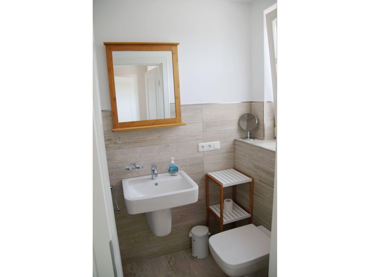 Im 1.OG gibt es 2 Schlafräume mit je einem Doppelbett, sowie ein geräumiges Bad mit großer Familiendusche und Eckbadewanne.
