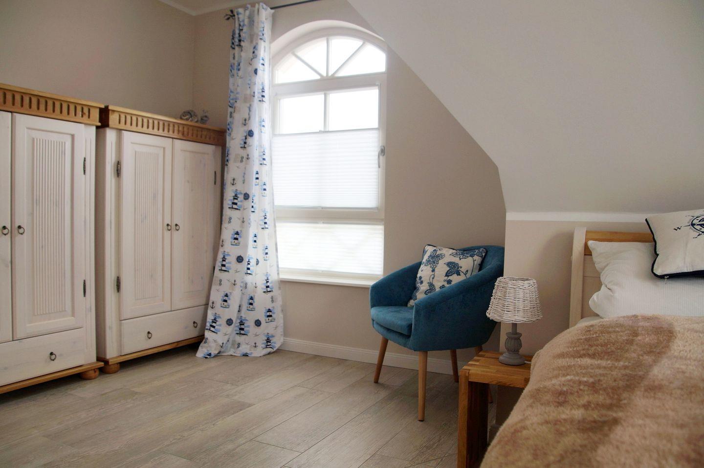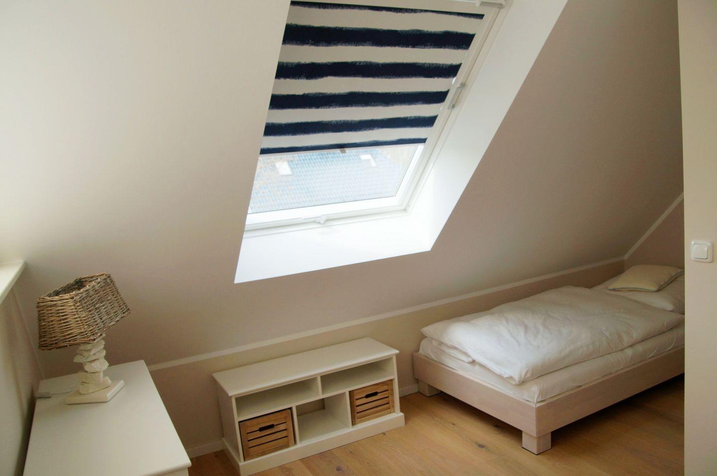 Das Dachgeschoss mit seinen 2 Einzelbetten bietet mit seinen großen Fensterflächen einen Blick in den Ostseehimmel.