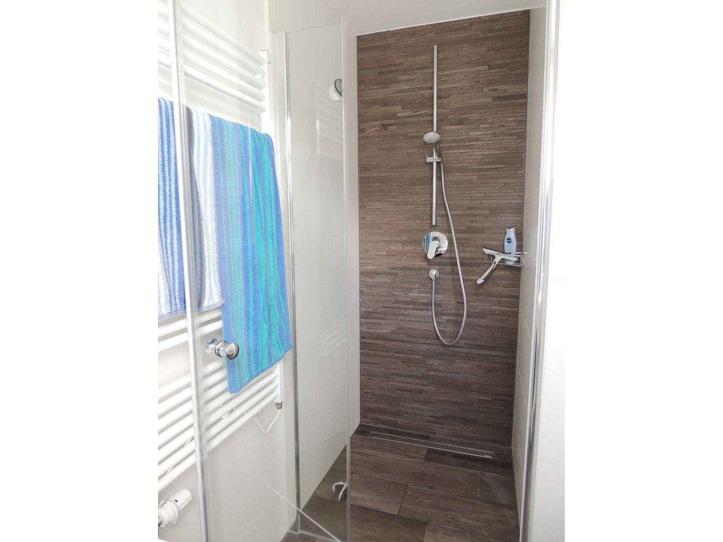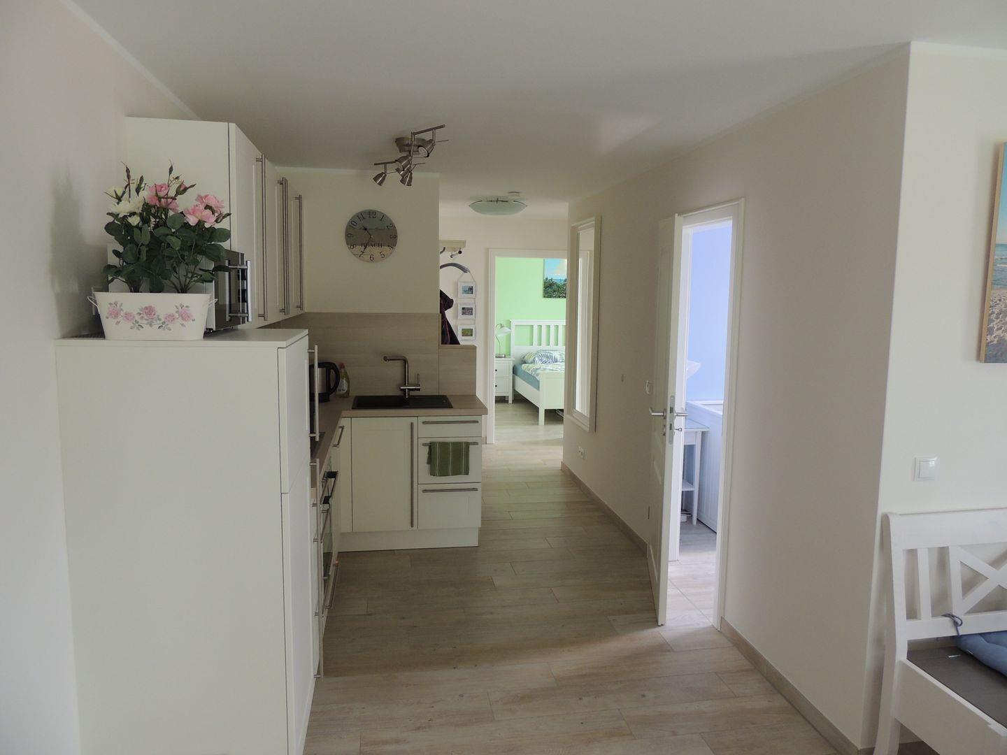 Die vollausgestattete Küche mit Cerankochfeld, Backofen, Mikrowelle und Geschirrspüler lässt keine Wünsche offen. Ein modernes Badezimmer mit ebenerdiger Dusche und Wäschetrockner rundet das Wohlfühlangebot ab.