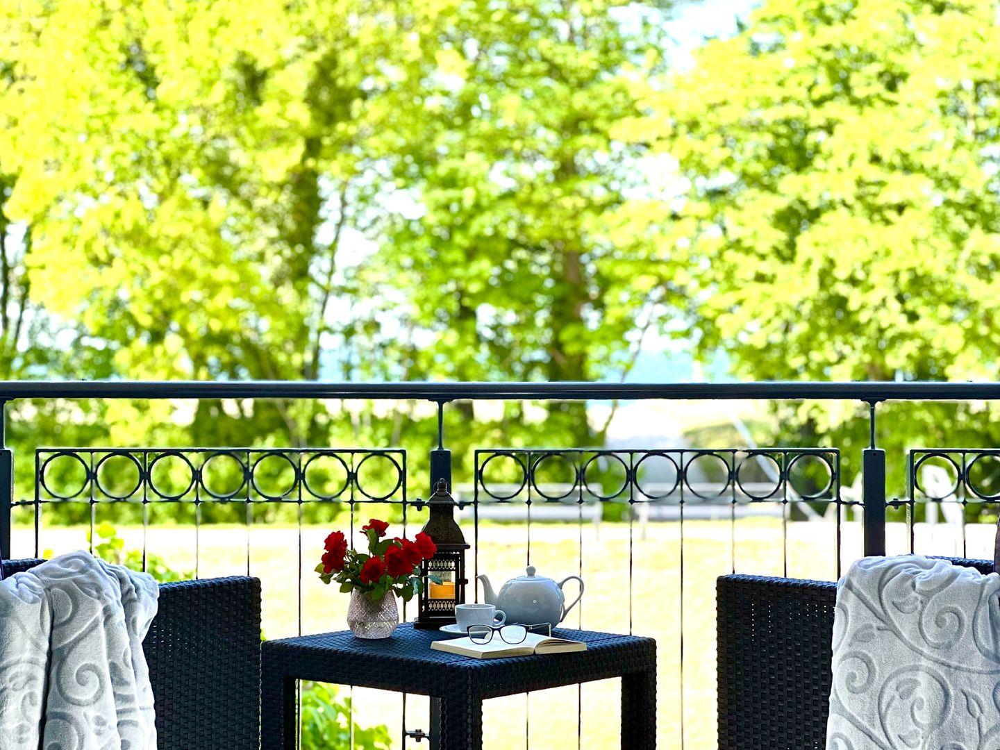 Der Balkon ist mit modernen Sitzmöbeln ausgestattet.