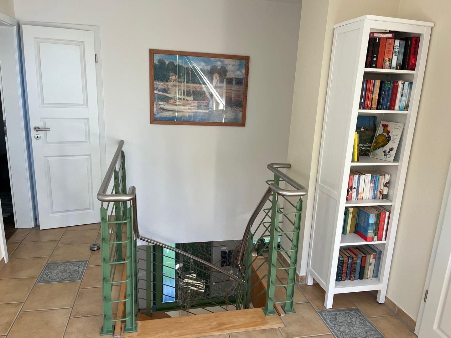Über eine offene Treppe gelangen Sie ins Obergeschoss. Auf der Galerie haben Sie durch die große Fensterfront einen herrlichen Blick über die Weiden vor dem Bodden.