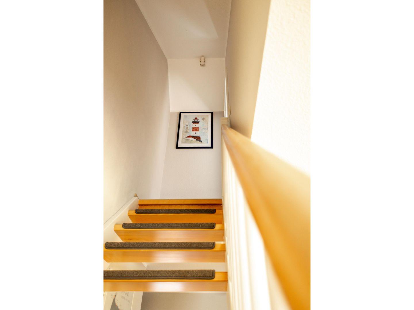 Eine Treppe führt vom Wohnzimmer in die obere Etage.