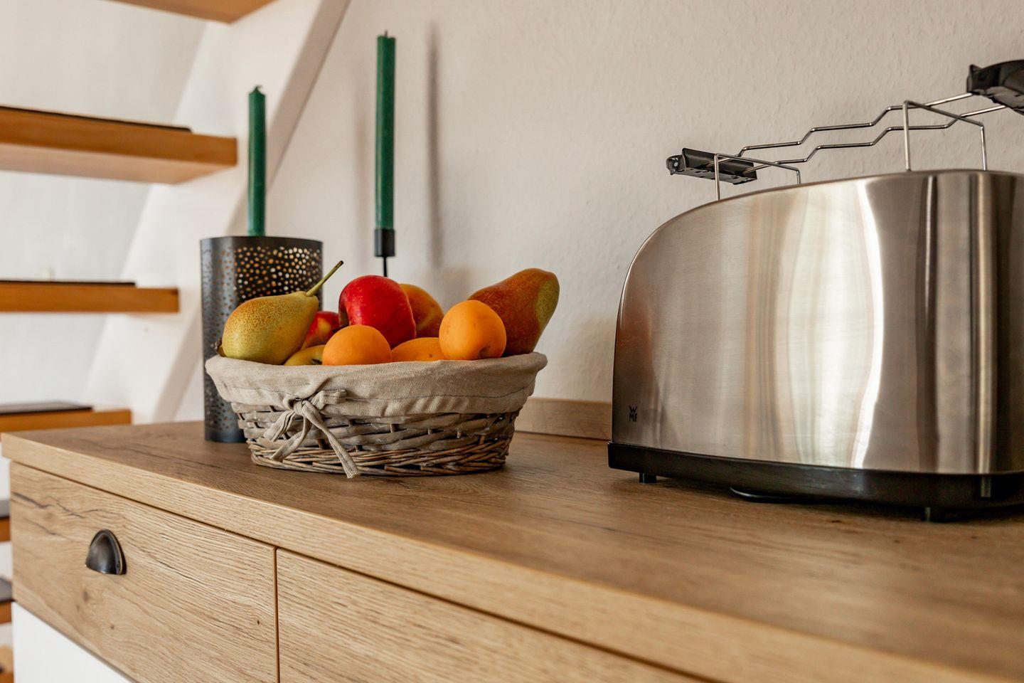 In der ersten Etage befindet sich der Wohnbereich mit Küchenzeile und Balkon und 2 separate Schlafzimmer.