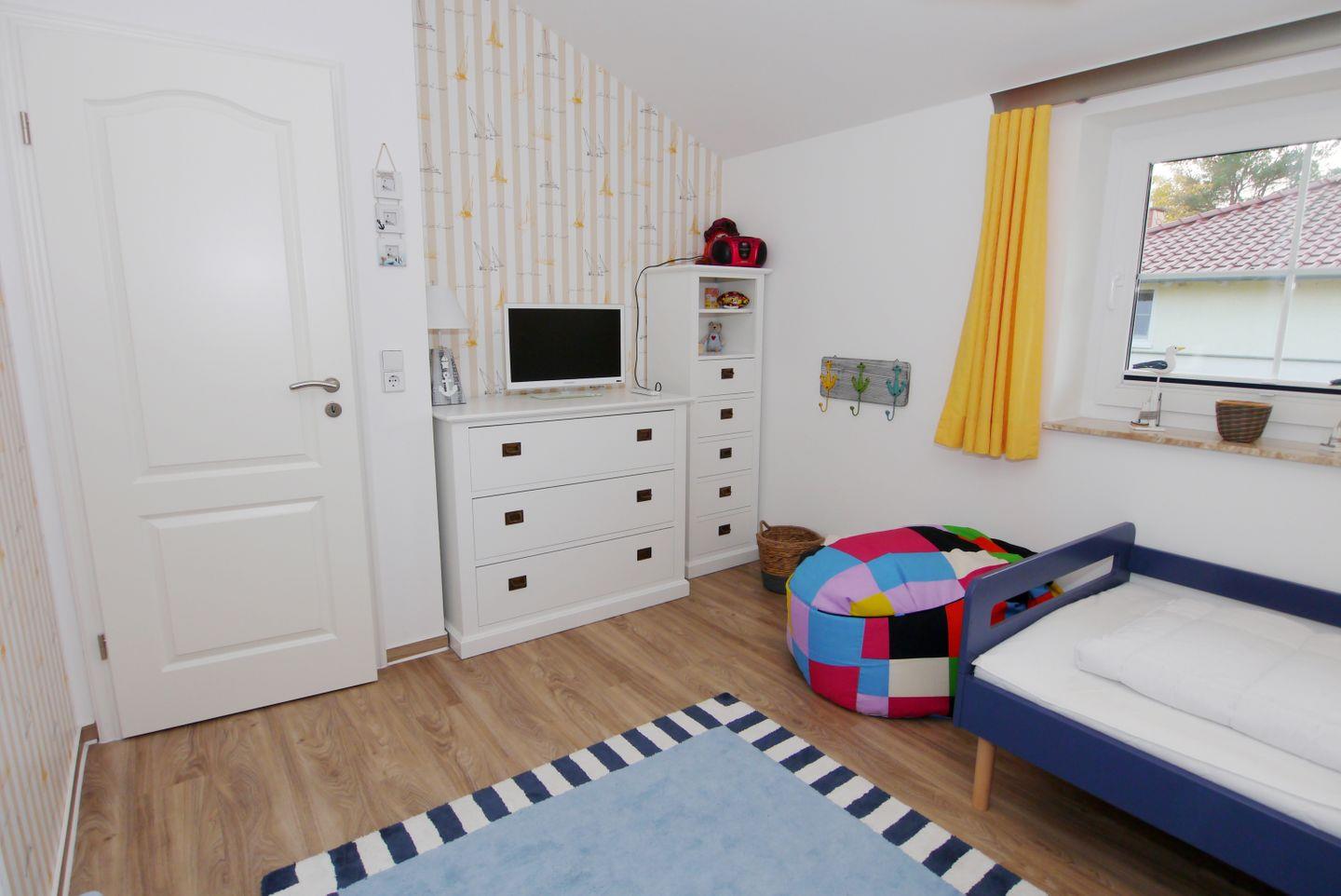 Das Kinderzimmer ist mit einem Einzelbett und einem Etagenbett eingerichtet, ein paar Spielsachen runden die Ausstattung ab.