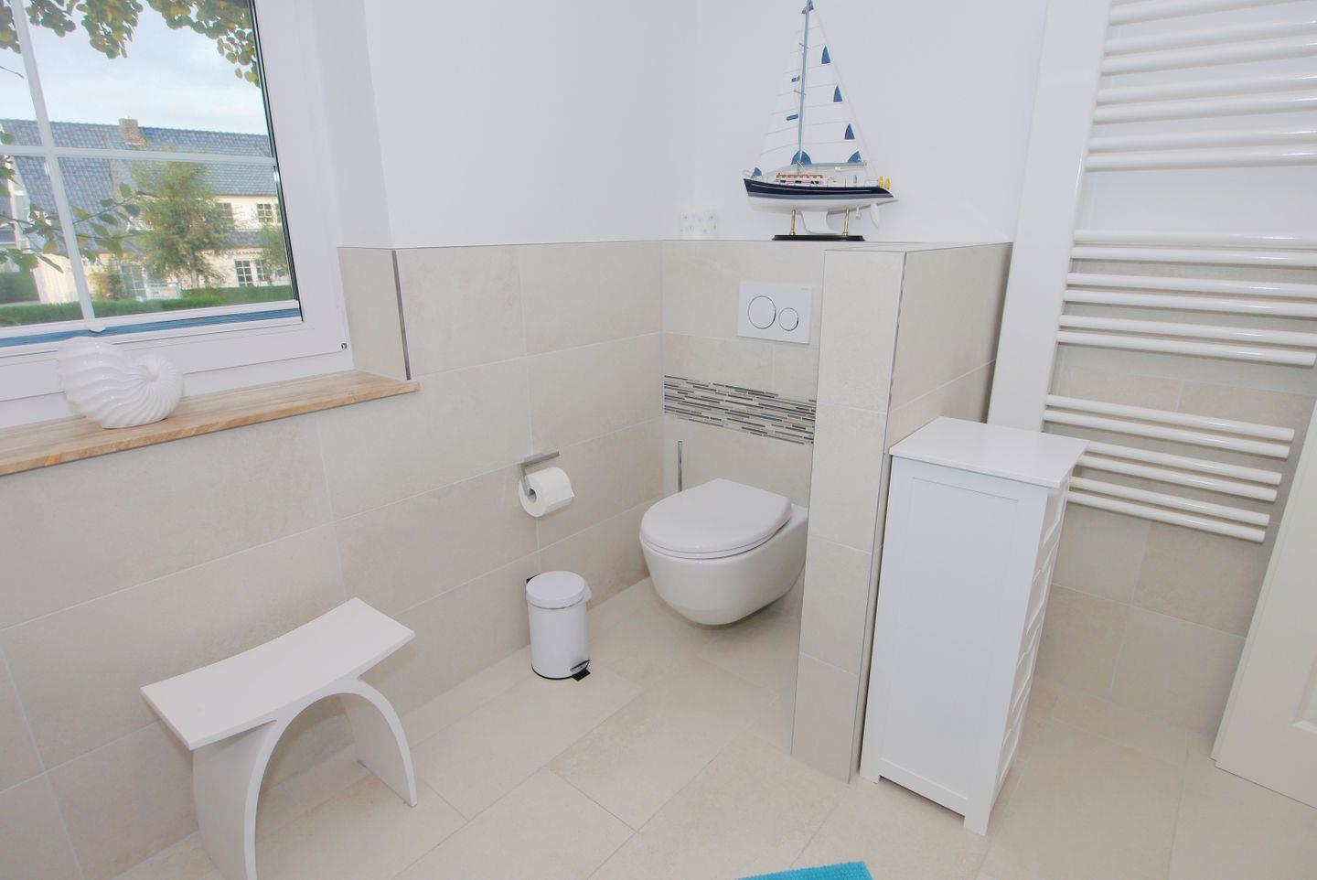 Das kleinere Badezimmer mit ebenerdiger Dusche und die Waschmaschine sind ebenfalls hier zu finden.
