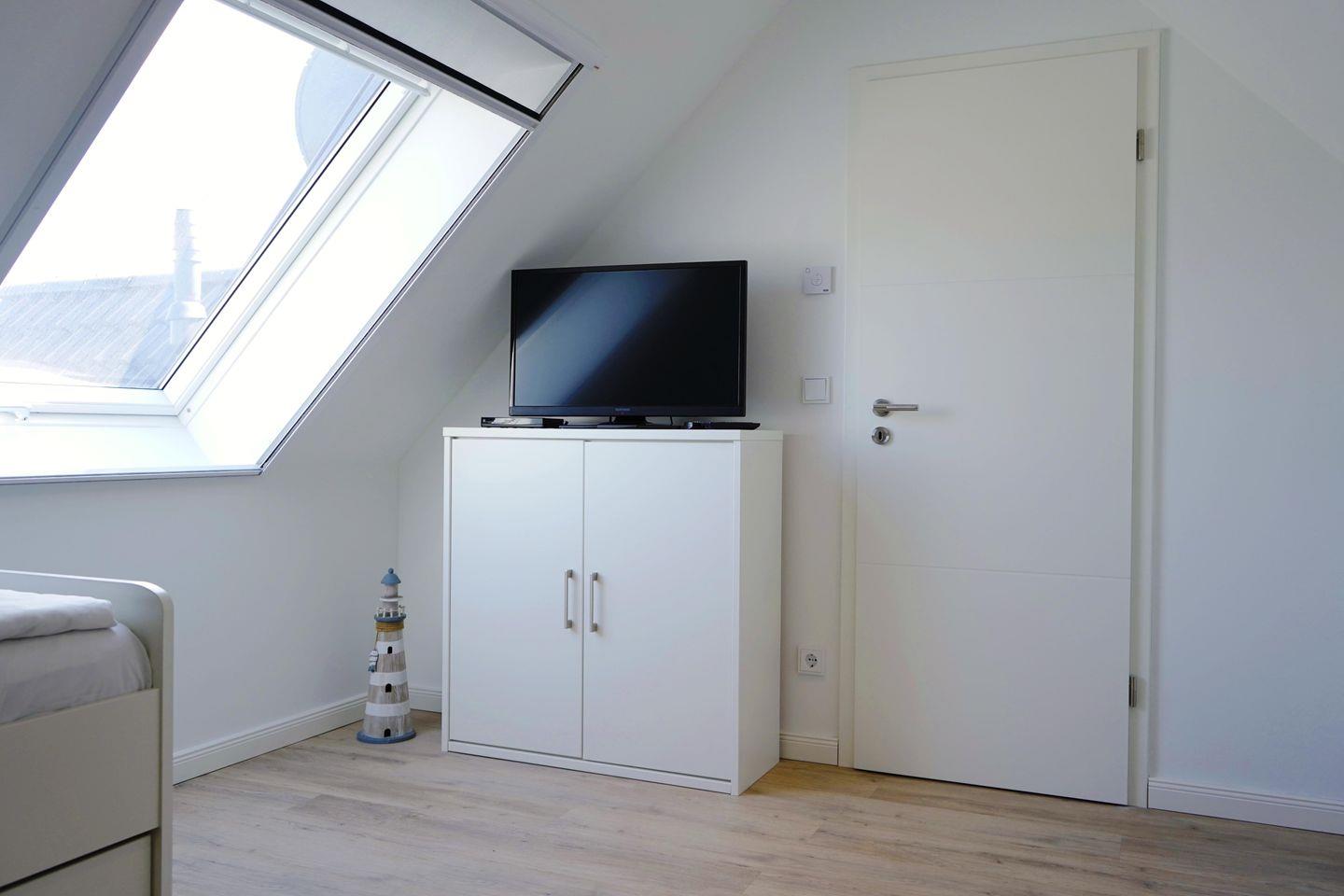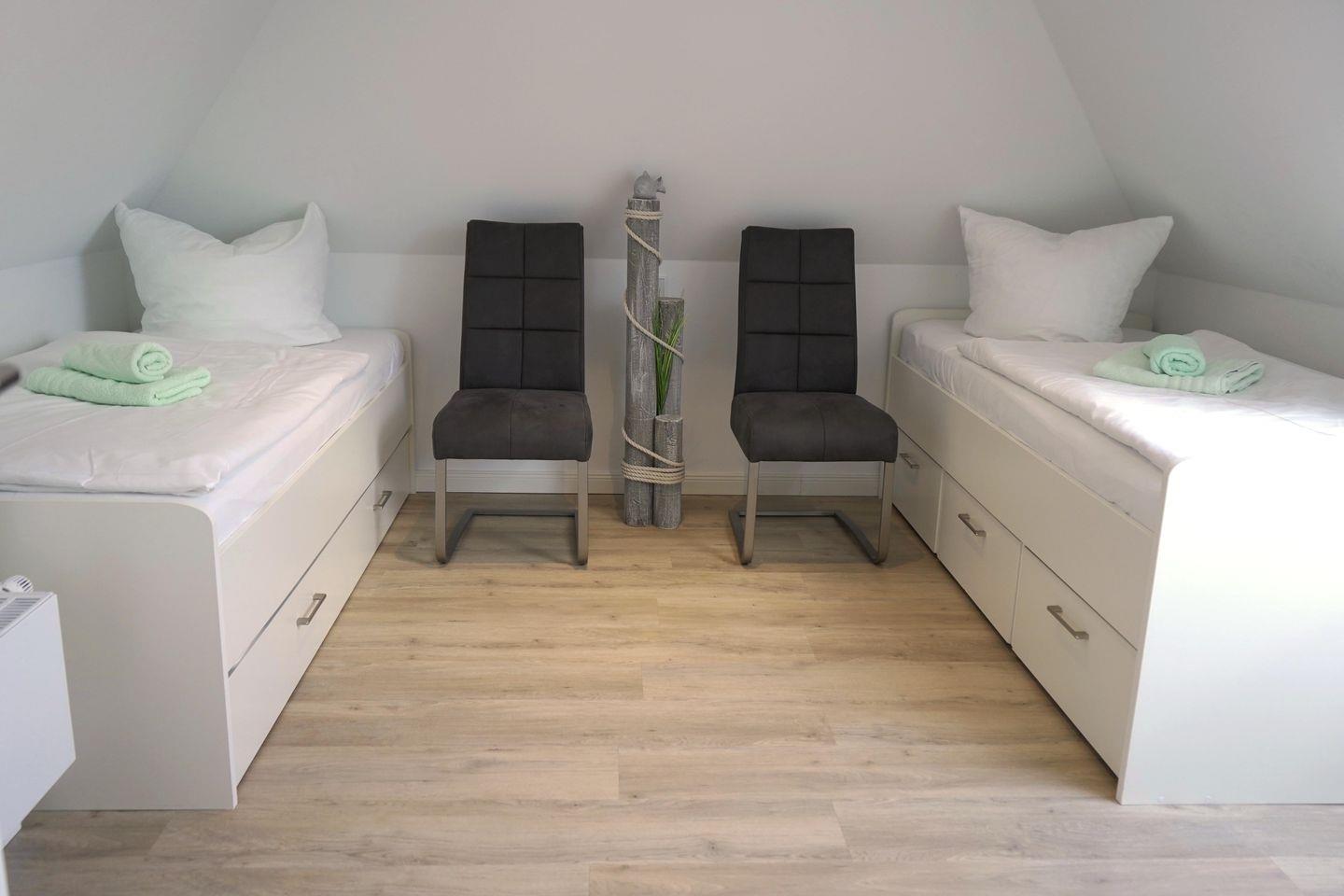 Im Obergeschoss finden Sie das 2. Schlafzimmer, welches über zwei Einzelbetten und eine weitere Aufbettung im Schubladenformat verfügt.