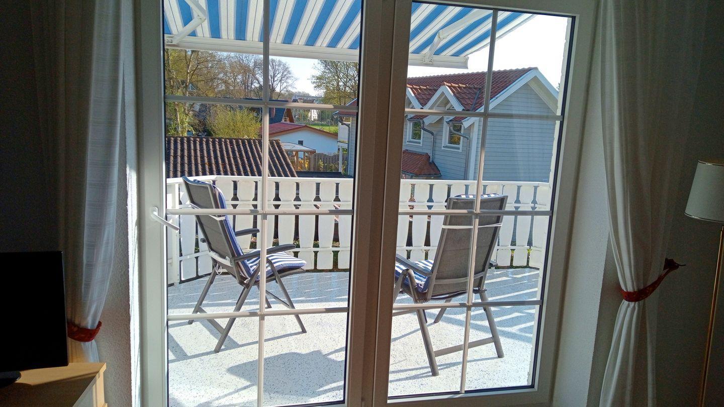 Der große Balkon verfügt über eine Markise und die halbrunde Ausrichtung nach Ost-Süd-West verspricht den ganzen Tag Sonne.