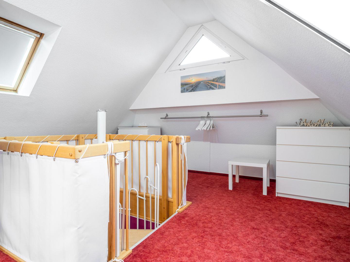 Über eine Wendeltreppe gelangen Sie in den Spitzboden der Eigentumswohnung. In diesem finden Sie ein Schlafzimmer mit Doppelbett, TV sowie einen offenen Ankleidebereich.