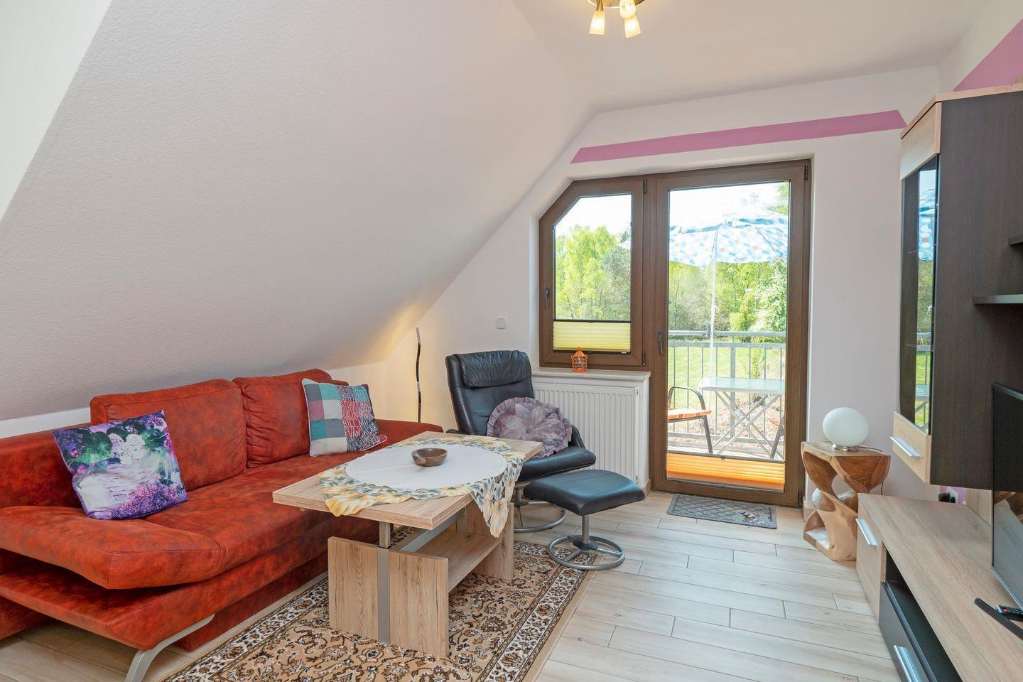 Ein besonderes Highlight der Unterkunft ist der Balkon, von dem aus Sie einen schönen Blick auf das umliegende Landschaftsschutzgebiet genießen können. Hier können Sie den Tag mit einer Tasse Kaffee oder einem Glas Wein ausklingen lassen und die frische Ostseeluft einatmen. Auch Gartenmöbel und Sonnenschirm stehen bereit, sodass Sie die Zeit im Freien ungestört genießen können.