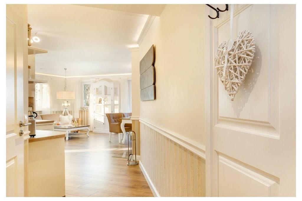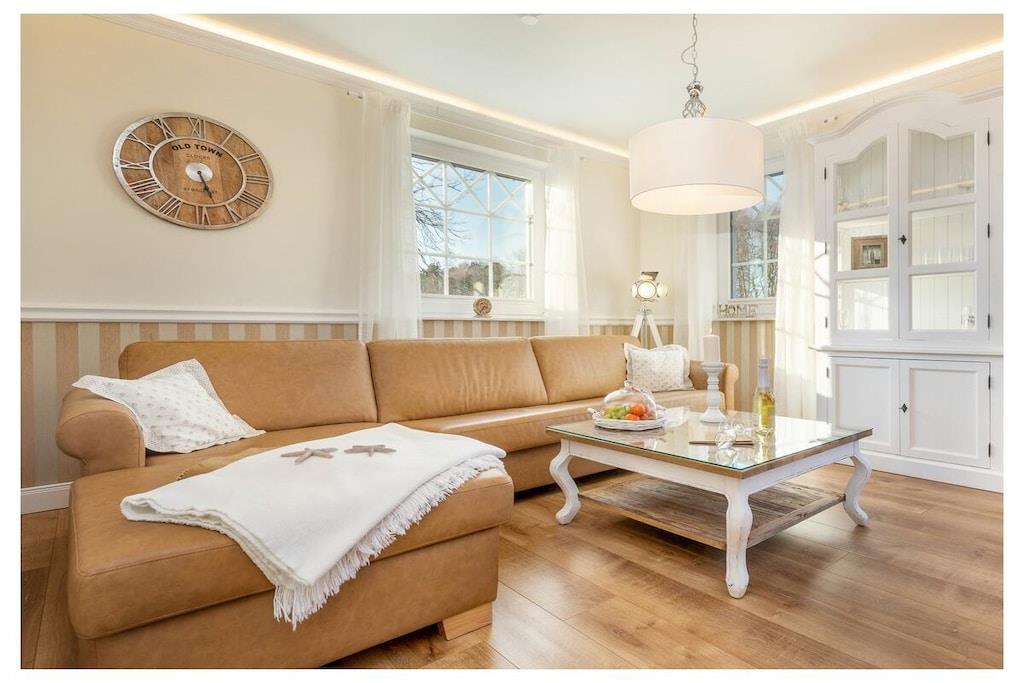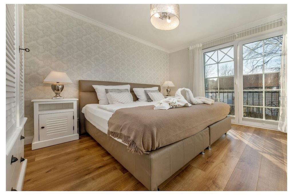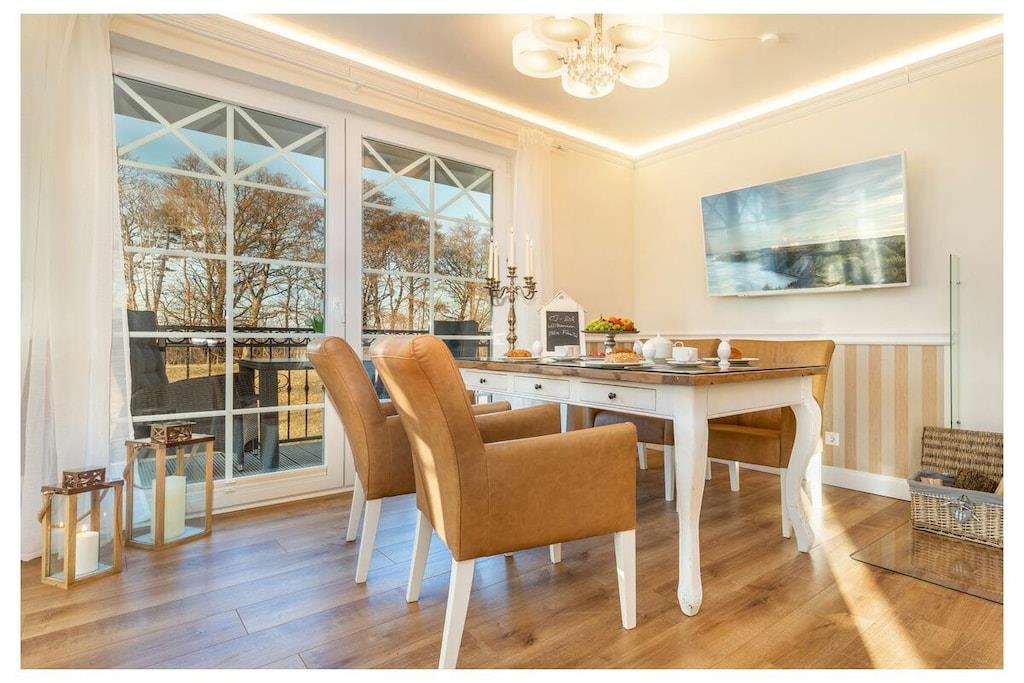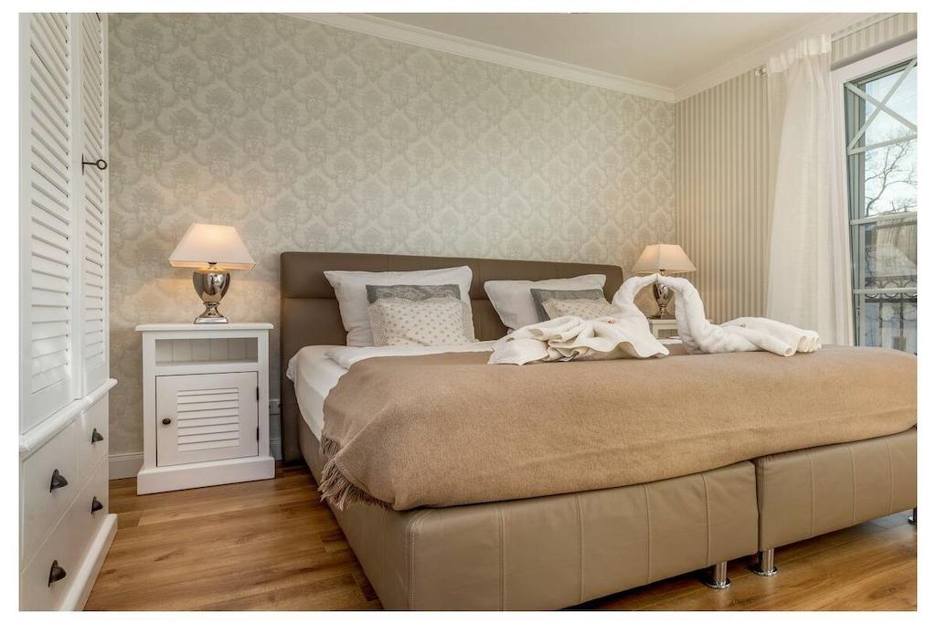 Du kan nyde ren luksus, da lejligheden har en pejs. Efter lange gåture på stranden kan du slappe af i saunaen eller tænde din egen pejs i lejligheden. Hele villaen er tilgængelig med elevator og er kørestolsvenlig, og den ligger direkte på stranden. Lejligheden har et fuldt udstyret moderne køkken med opvaskemaskine, emhætte, komfur – alt hvad du måtte have brug for. Badeværelset har bruseniche med gulvvarme og spa-bruser. Indirekte belysning er integreret i stuklisterne i stuen, og der er også et fladskærms-tv i soveværelset. Villa Strandblick blev færdiggjort i november 2017.
