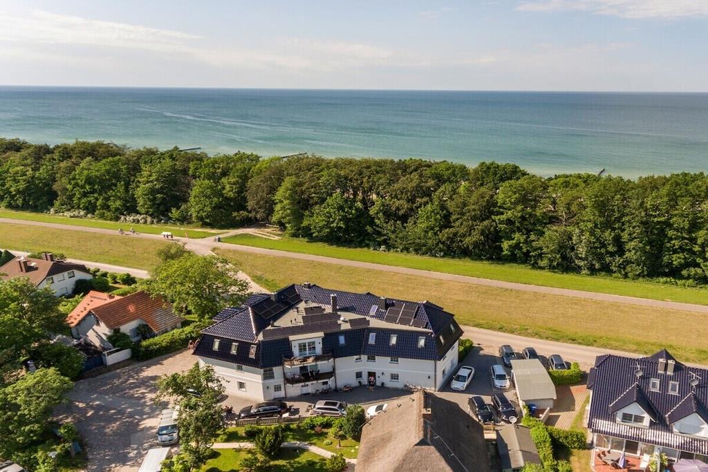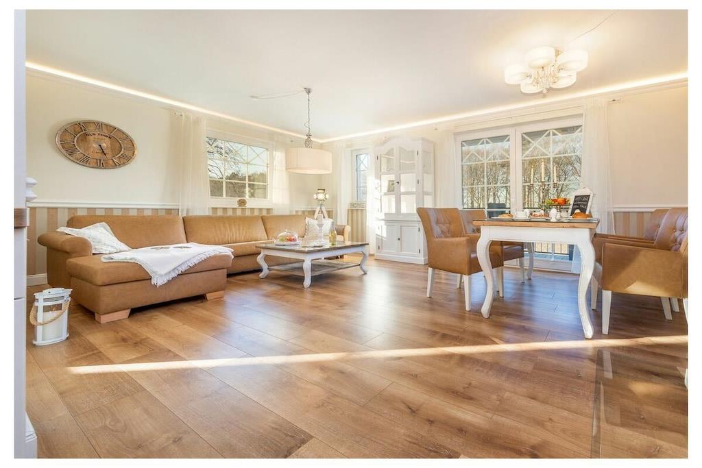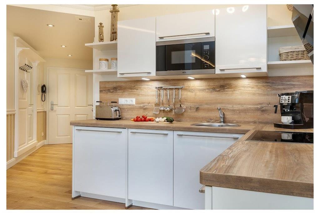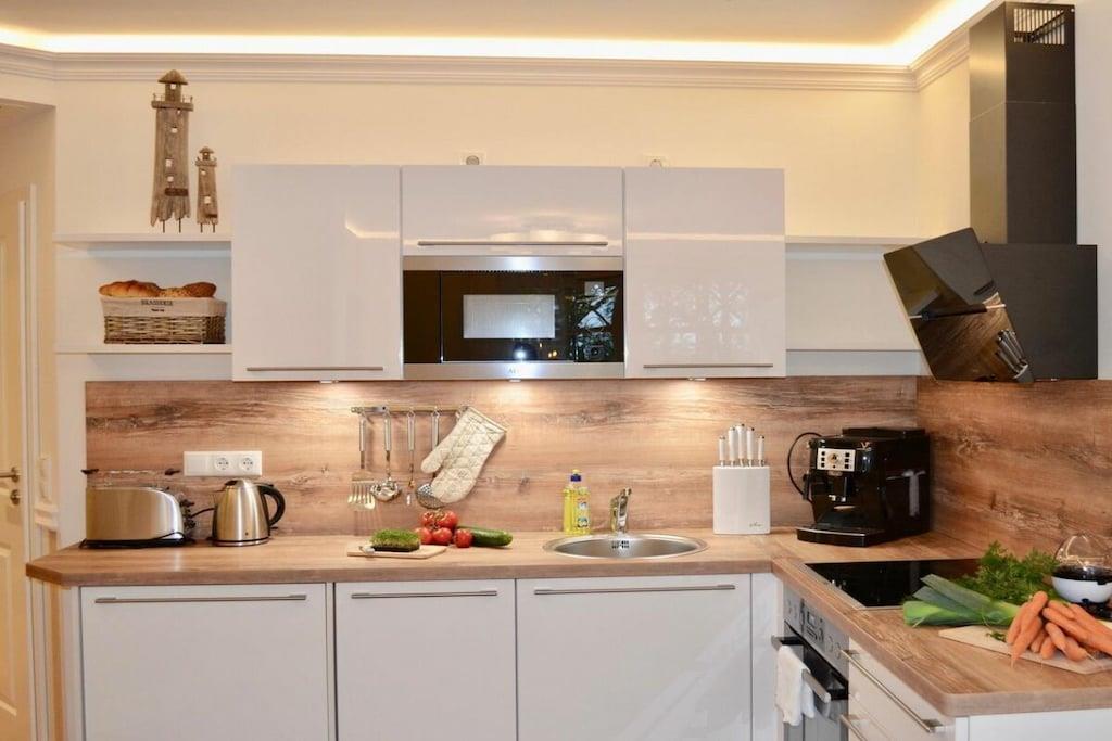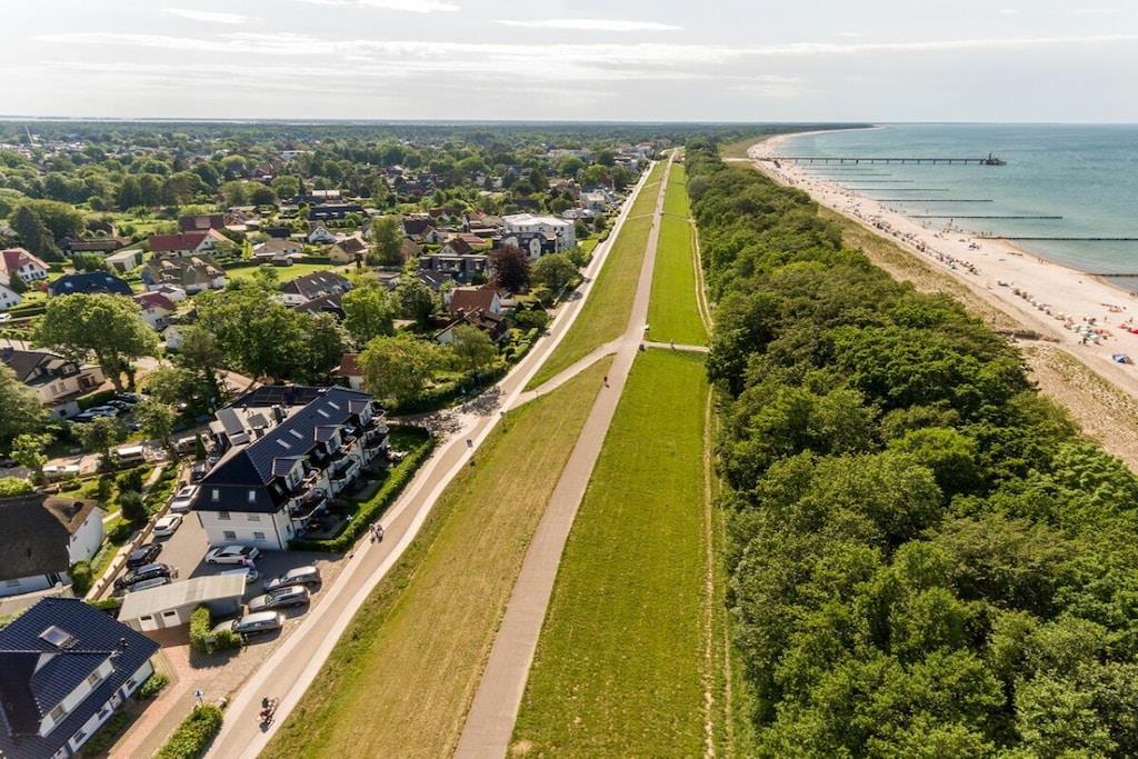 Du kan nyde ren luksus, da lejligheden har en pejs. Efter lange gåture på stranden kan du slappe af i saunaen eller tænde din egen pejs i lejligheden. Hele villaen er tilgængelig med elevator og er kørestolsvenlig, og den ligger direkte på stranden. Lejligheden har et fuldt udstyret moderne køkken med opvaskemaskine, emhætte, komfur – alt hvad du måtte have brug for. Badeværelset har bruseniche med gulvvarme og spa-bruser. Indirekte belysning er integreret i stuklisterne i stuen, og der er også et fladskærms-tv i soveværelset. Villa Strandblick blev færdiggjort i november 2017.