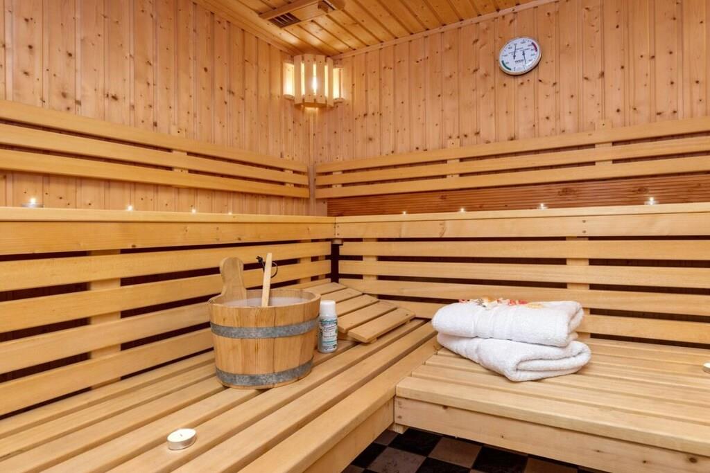 , Stue(, enkeltsovesofa, Fjernsyn, radio, CD-afspiller), Køkken(, elkedel, brødrister, kaffemaskine, ovn, opvaskemaskine , køleskab, fryser), soveværelse(, dobbeltseng, Fjernsyn, barneseng), soveværelse(, dobbeltseng, Fjernsyn), badeværelse(, toilet, bruser, føntørrer), loungerum(sauna, bruser), Internetadgang, strygebræt, strygejern