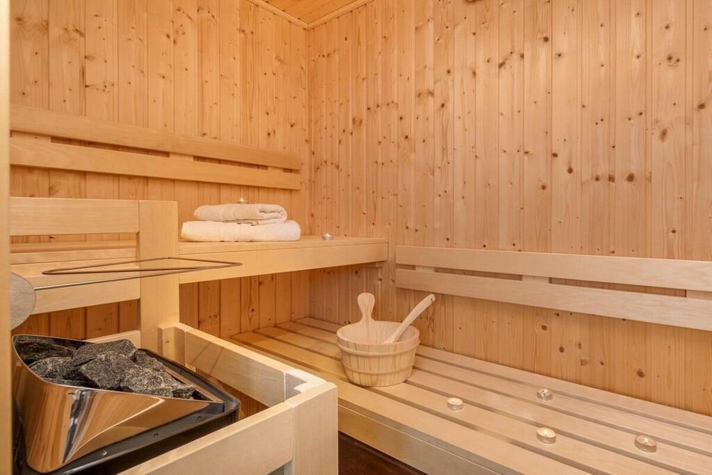 , Stue(, , spisebord, radio, varme), Køkken(, , kaffemaskine, ovn, køleskab, fryser), soveværelse(dobbeltseng), soveværelse(dobbeltseng, dobbeltseng), badeværelse(, bruser, føntørrer), badeværelse(, bruser, føntørrer), loungerum(sauna), garage, Internetadgang, vaskemaskine, balkon(havemøbler), balkon(havemøbler), strygebræt, strygejern