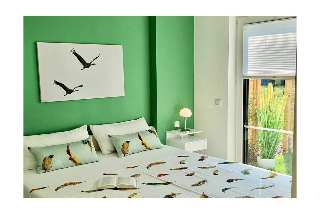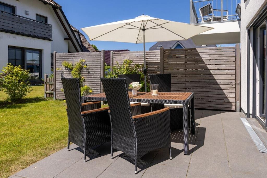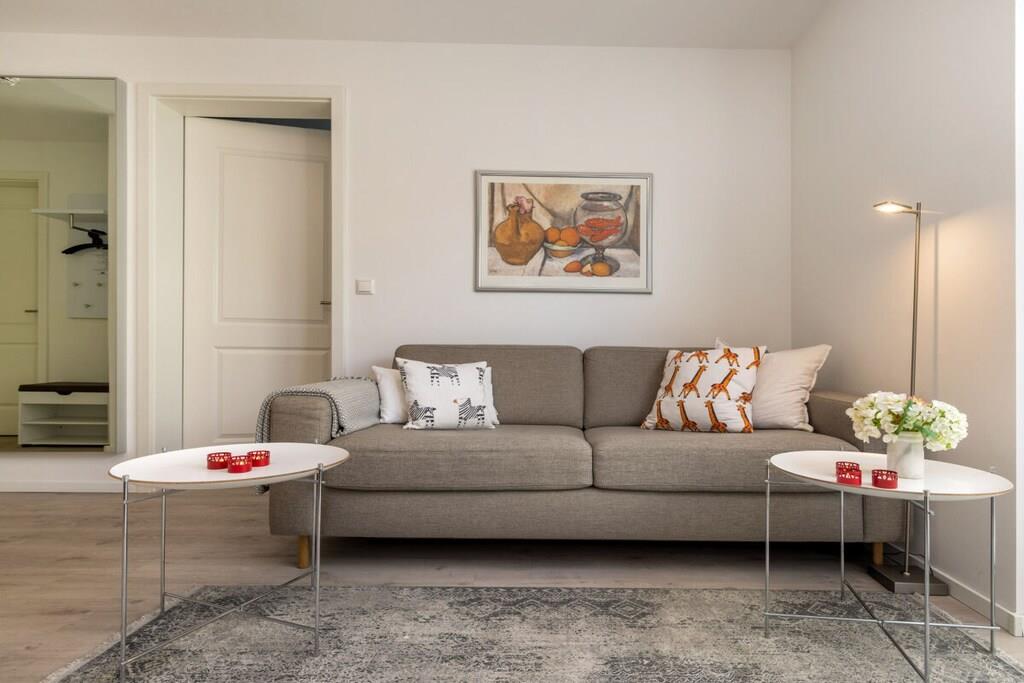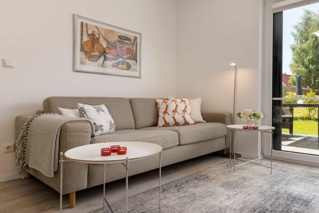 Nyd din morgenkaffe på din private terrasse, eller slap af på den behagelige sofa efter et besøg på stranden og se tv med dine kære. Denne dejligt lyse lejlighed ligger i stueetagen. Stue- og spisestuen med åbent køkken samt soveværelset åbner ud til den vestvendte terrasse med en lille have. Den har et fuldt udstyret køkken, et rummeligt badeværelse med bruseniche, et hyggeligt soveværelse med en stor dobbeltseng (160 x 200 cm) og et opbevaringsrum med vaskemaskine og alle nødvendige fornødenheder. Sofaen kan nemt laves om til en dobbeltseng med en 140 x 200 cm boxmadras, så dit barn eller barnebarn også kan sove komfortabelt.