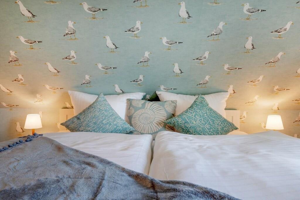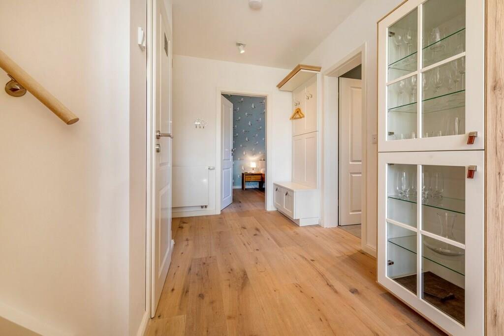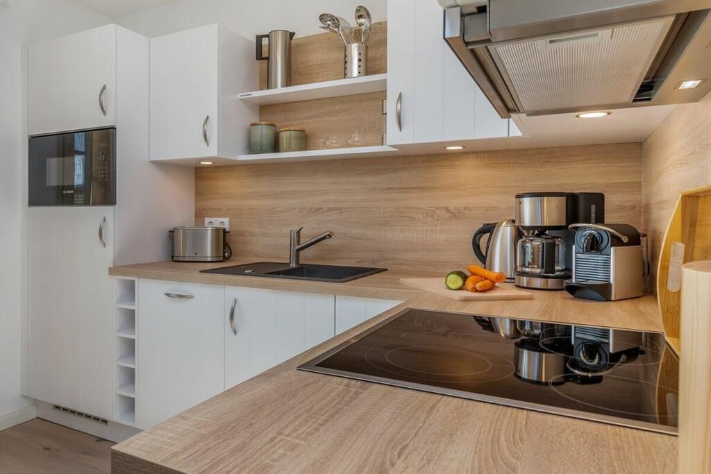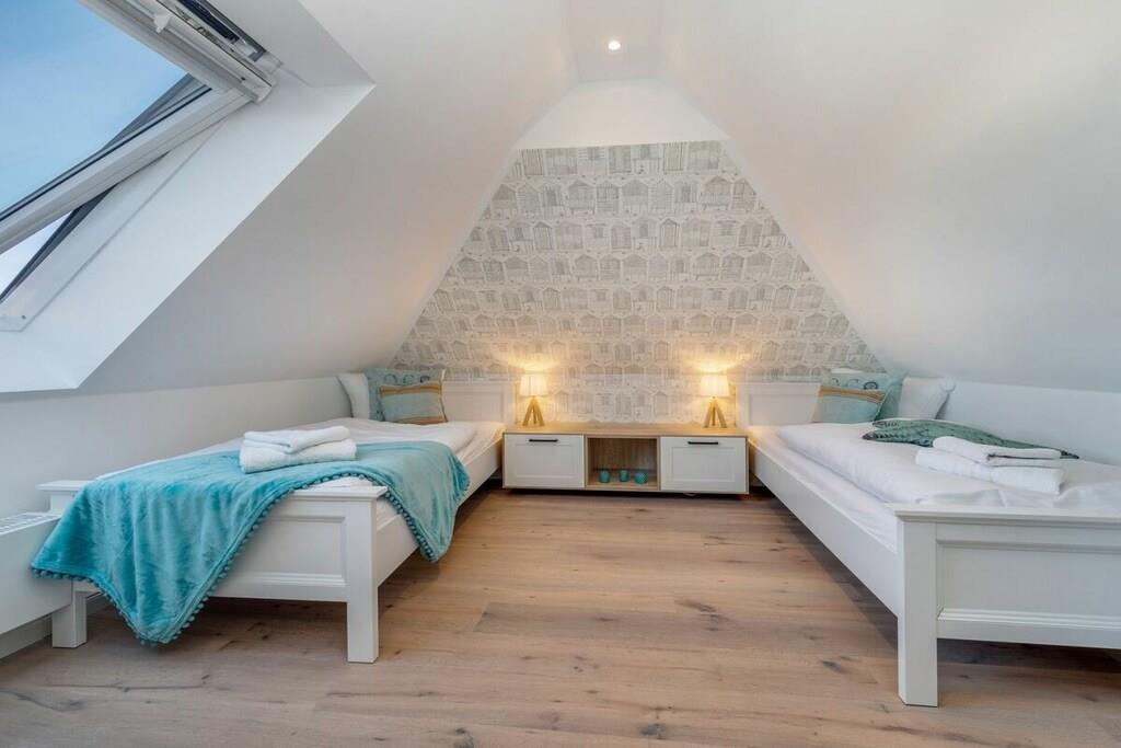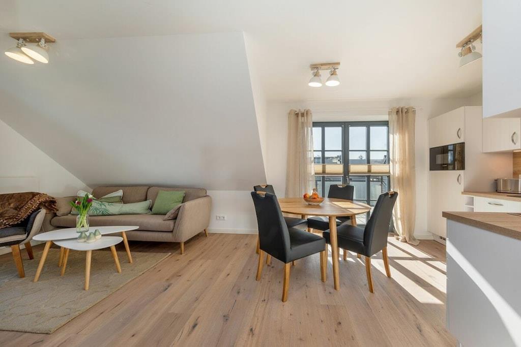 Den rummelige opholds- og spisestue har et moderne, fuldt udstyret køkken, perfekt til at tilberede lækre måltider. Opholdsstuen har en gaspejs, bøger og brætspil til underholdning. Soveværelset i stueetagen er møbleret med en komfortabel boxmadras på 180 cm x 200 cm, og soveværelset på loftet har to enkeltsenge, der måler 90 cm x 200 cm. En rejseseng og højstol kan bookes efter anmodning. Badeværelset med bruser har gulvvarme og indbygget radio. Hele lejligheden er udstyret med persienner og insektnet i vinduerne.