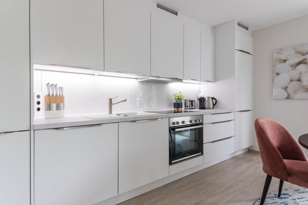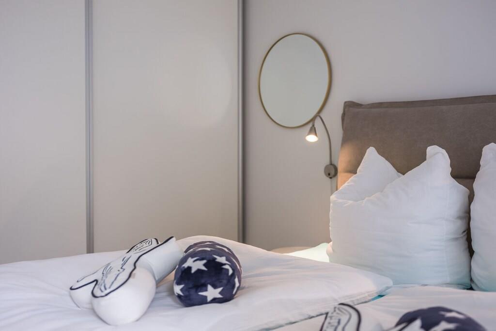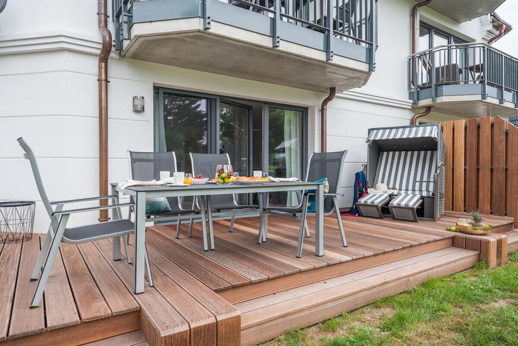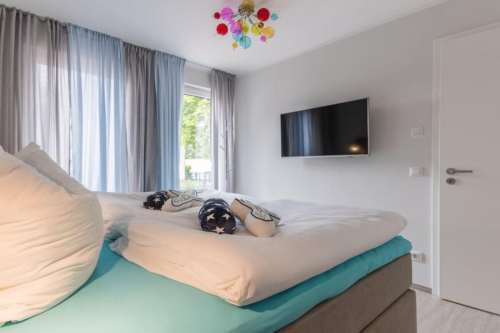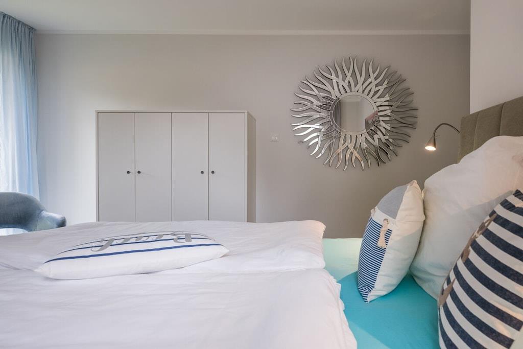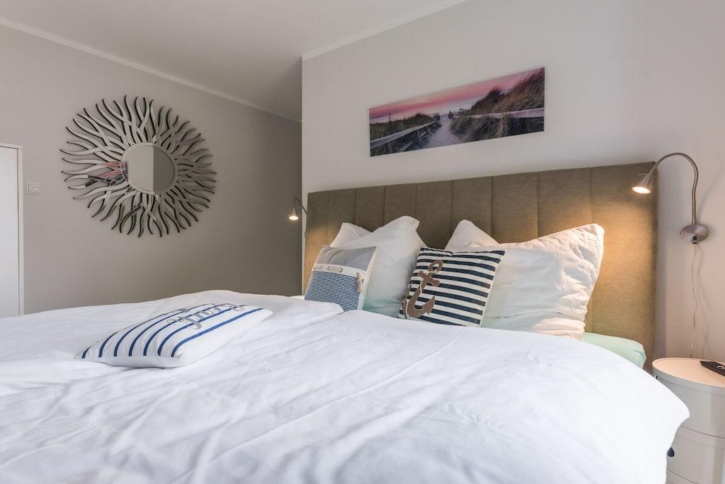 Moderne lejlighed direkte på stranden med infrarød sauna. Stor terrasse på ca. 40 m² med strandstol, spiseplads, elektrisk grill, liggestole og loungesæt. Lejlighed med åben stue/spisestue og pejs, et køkken af høj kvalitet og spisebord. Begge soveværelser har en stor boxmadras og et tv. Badeværelse med dagslys, bruseniche, oplyst sminkespejl og LED-oplyst badeværelsesspejlskab. Gulv-til-loft-vinduer gør alle værelser smukt lyse. De er også udstyret med insektnet. Vaskemaskine, Wi-Fi, parkering i den underjordiske garage (indgangshøjde 1,95 m) og elevator er tilgængelige. Du kan selv låse dine cykler i cykelstativerne ved huset.