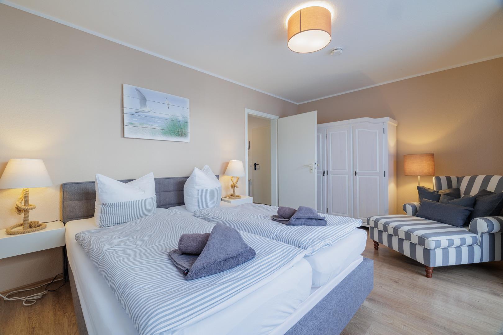 Schlafzimmer mit Wohlfühlfaktor: Ein stilvoll eingerichtetes Schlafzimmer mit komfortablem Doppelbett und sanften, maritimen Farbtönen sorgt für erholsame Nächte.