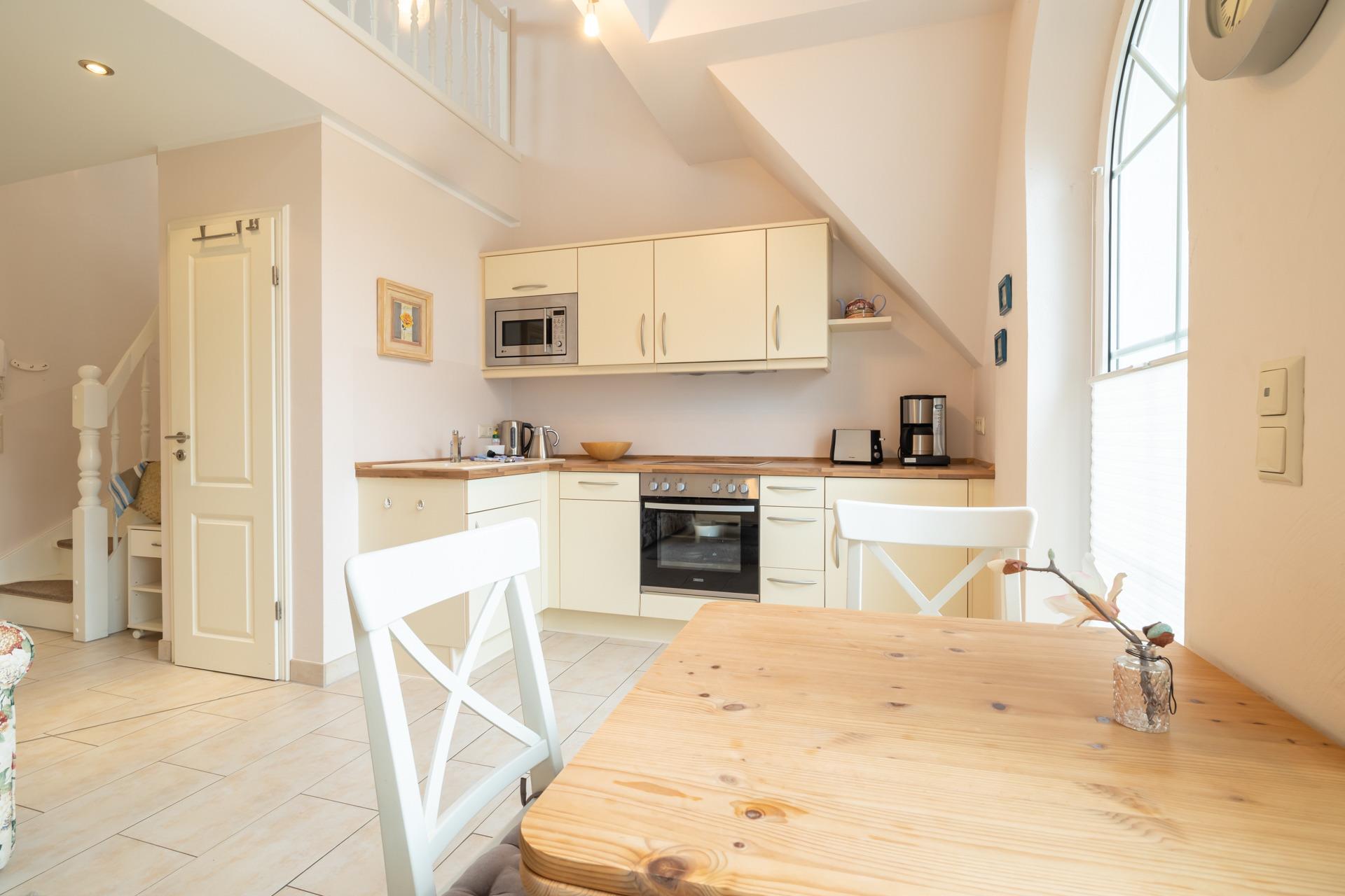 Offene Küche: Eine gut ausgestattete Küche mit Essbereich lädt zu gemeinsamen Kochabenden ein.