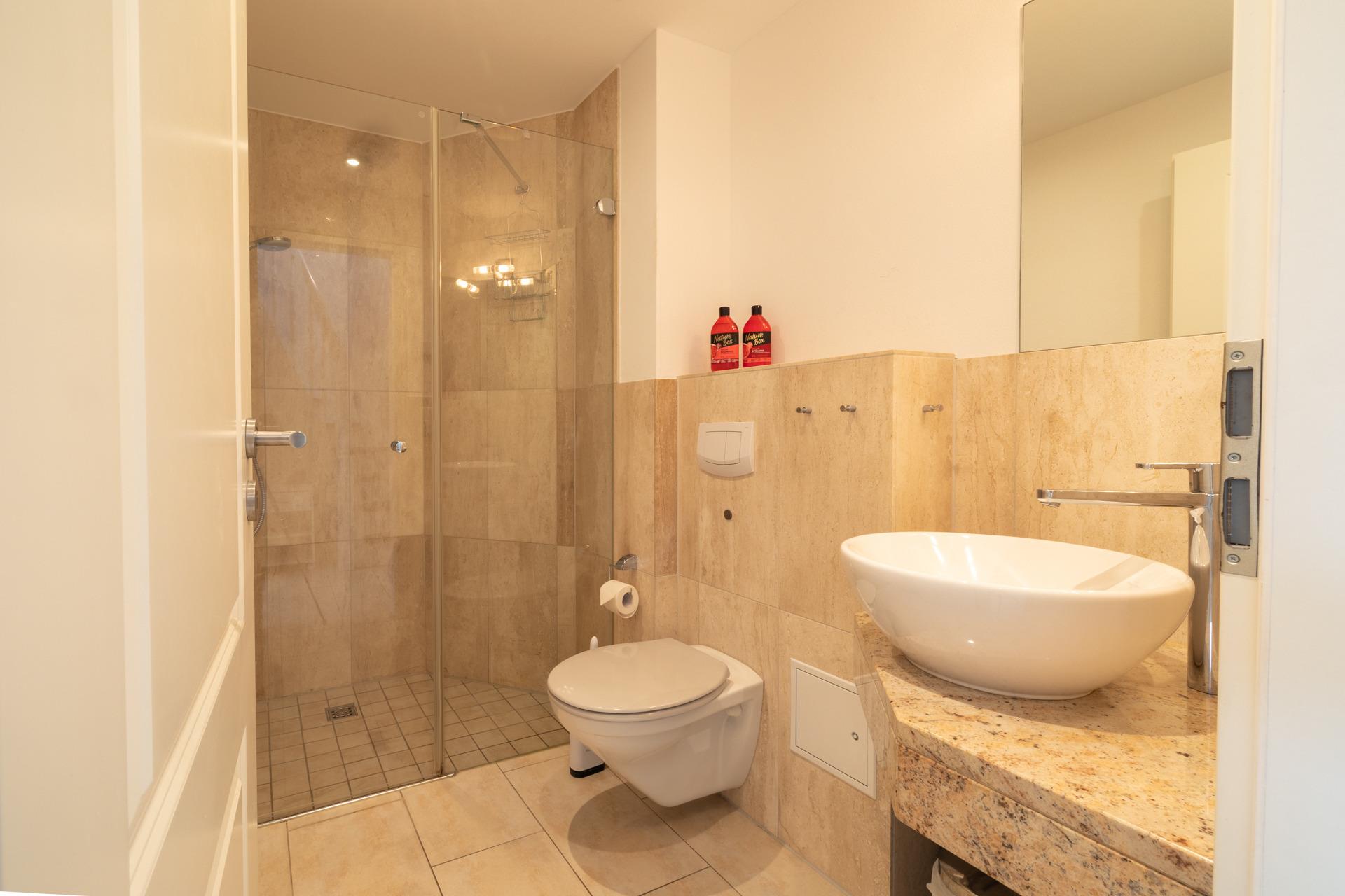 Wellness-Momente: Ein stilvolles Badezimmer mit einer Dusche, rundet den luxuriösen Komfort ab.