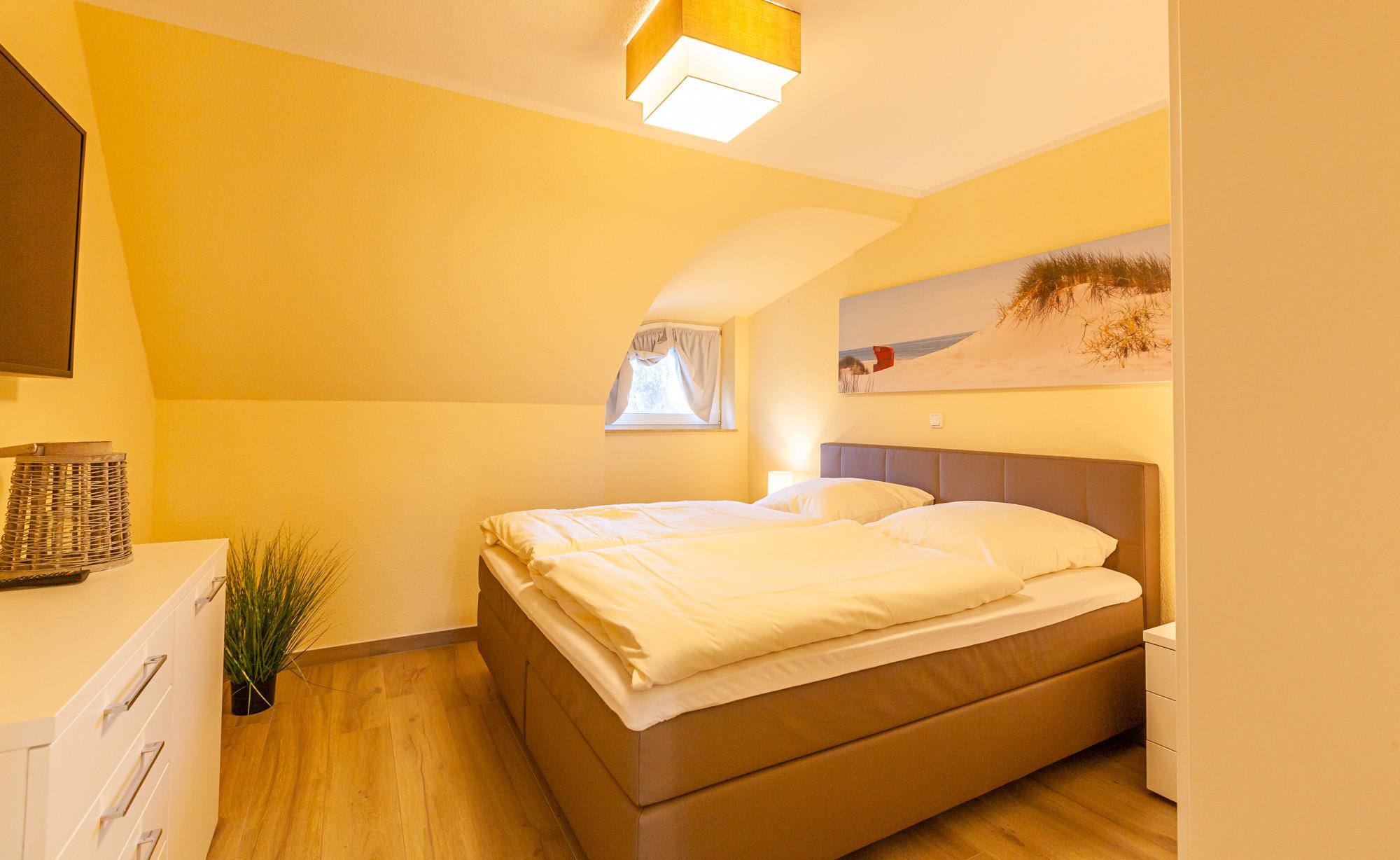 ... und ist ausgestattet mit drei Schlafräumen (1x1 Doppelbett, 1x1 Doppelbett, 1x2 Einzelbetten) jeweils mit zusätzlichen Verdunklungsmöglichkeiten, einem Wohnbereich mit Kamin und einer Küchenzeile (Mikrowelle, Cerankochfeld, Backofen, Kühlschrank mit Gefrierfach, Spülmaschine, Kaffeemaschine), zwei Bädern (1 x bodengleiche Dusche / WC und Sauna,