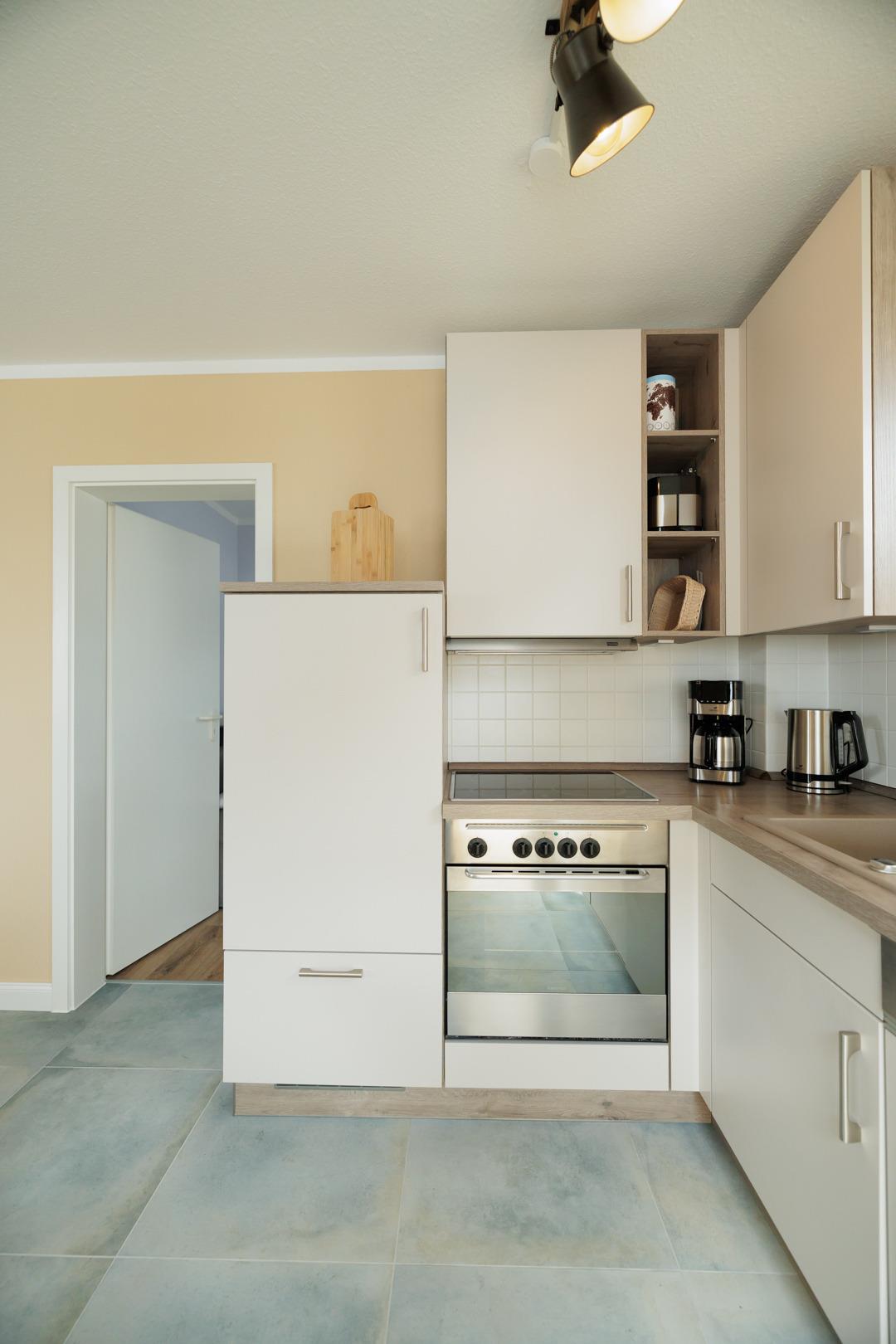Die gut ausgestattete Küche besitzt unter anderem einen Kühlschrank, einen Herd zum Kochen und sogar eine Spülmaschine.