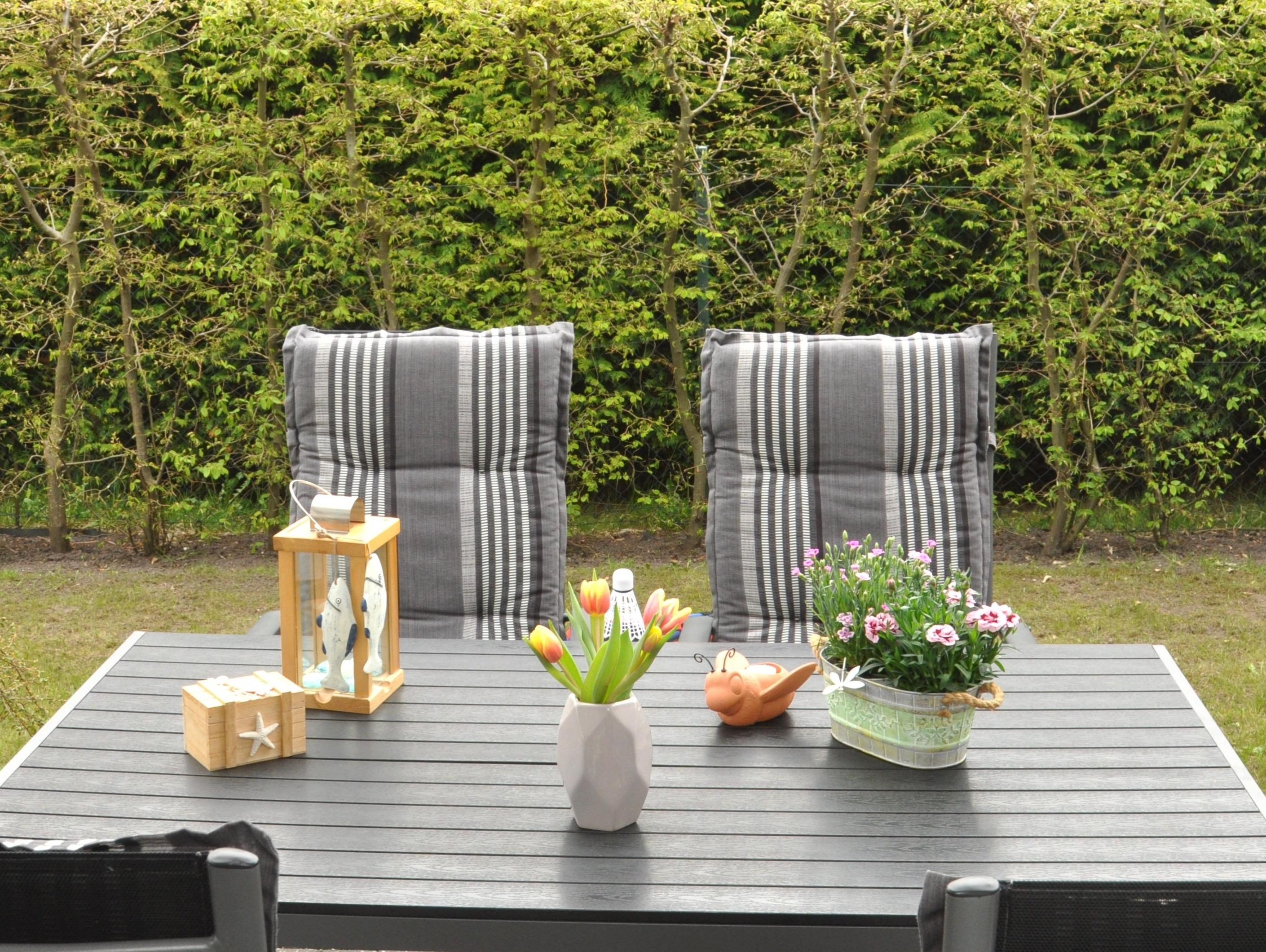 Zur Ferienwohnung gehören ein PKW-Stellplatz, ein gemeinschaftlicher Fahrradabstellraum sowie eine Süd-Terrasse mit Gartenmöbel und Elektrogrill.