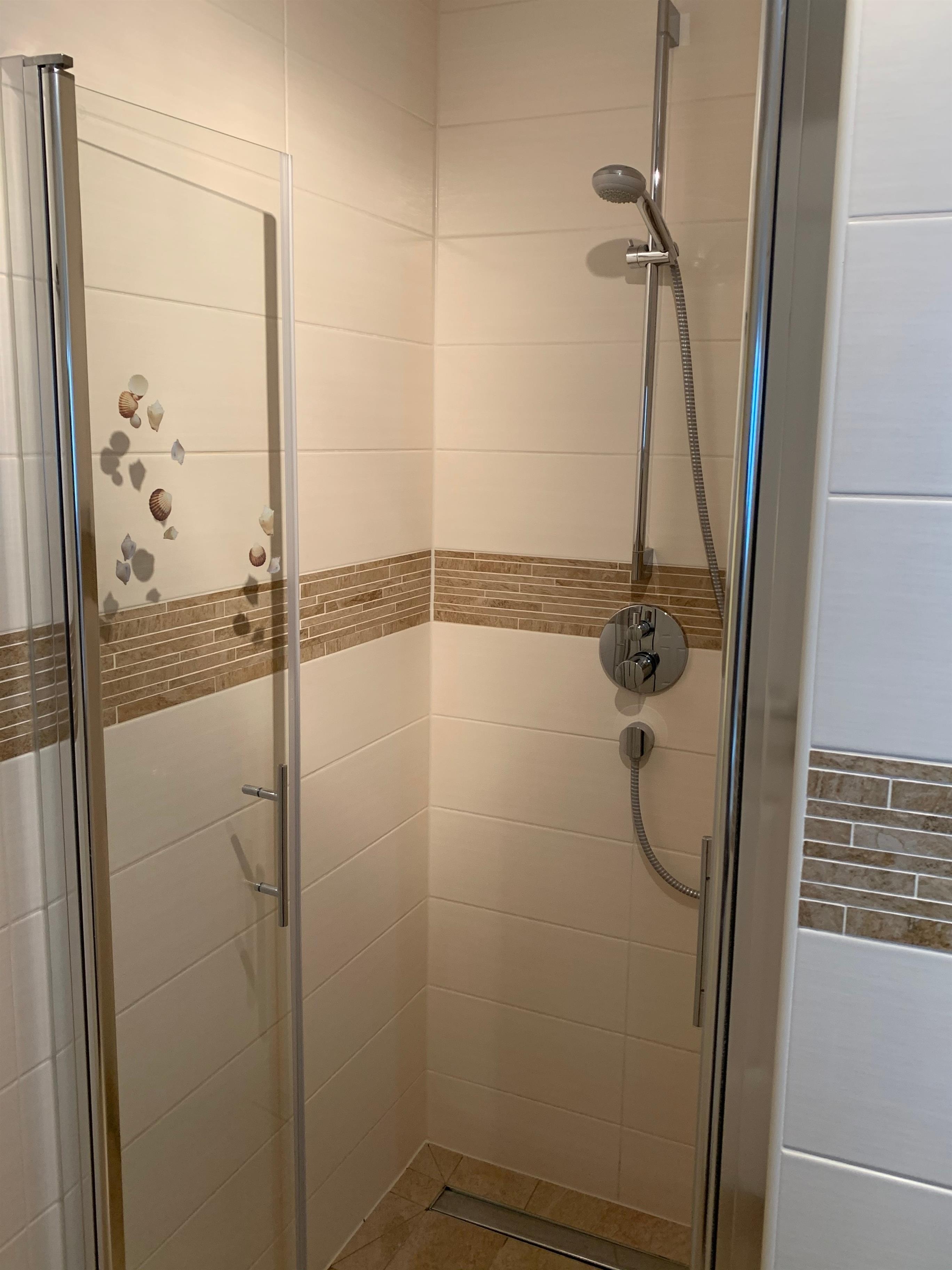 Das Bad besteht aus einer ebenerdigen Dusche und Waschtisch. Fön und Handtuchtrockner stehen Ihnen auch zur Verfügung.