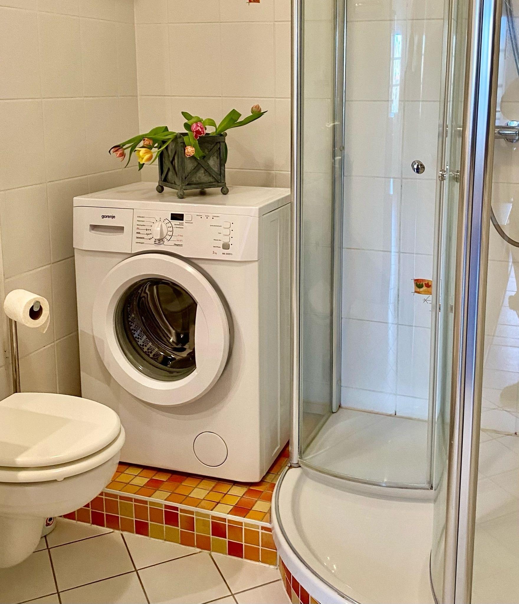 Badezimmer mit Dusche und WC, Waschmaschine, Schlafzimmer mit Doppelbett und einem EInzelbett.