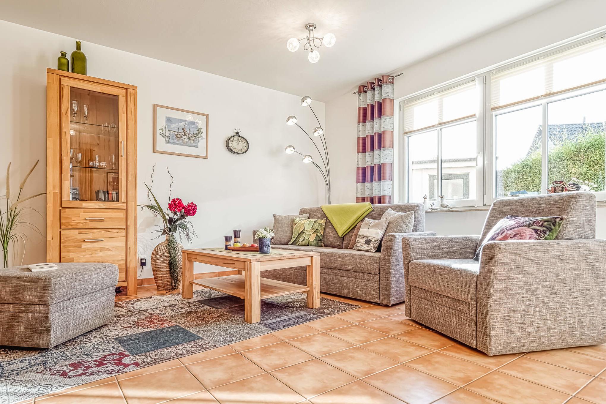 Das gemütliche Wohnzimmer ist mit einem schönen Essbereich für bis zu vier Personen ausgestattet. Ebenso gehören eine bequeme Schlafcouch mit Sessel und Hocker, ein moderner Flachbildfernseher und eine Stereoanlage mit Radio zur Wohneinrichtung. Hier ist auch eine Aufbettung für zwei weitere Personen möglich. Ein Babybett und ein Hochstuhl stehen zusätzlich zur Verfügung. Kostenloses WLAN ist ebenfalls vorhanden.