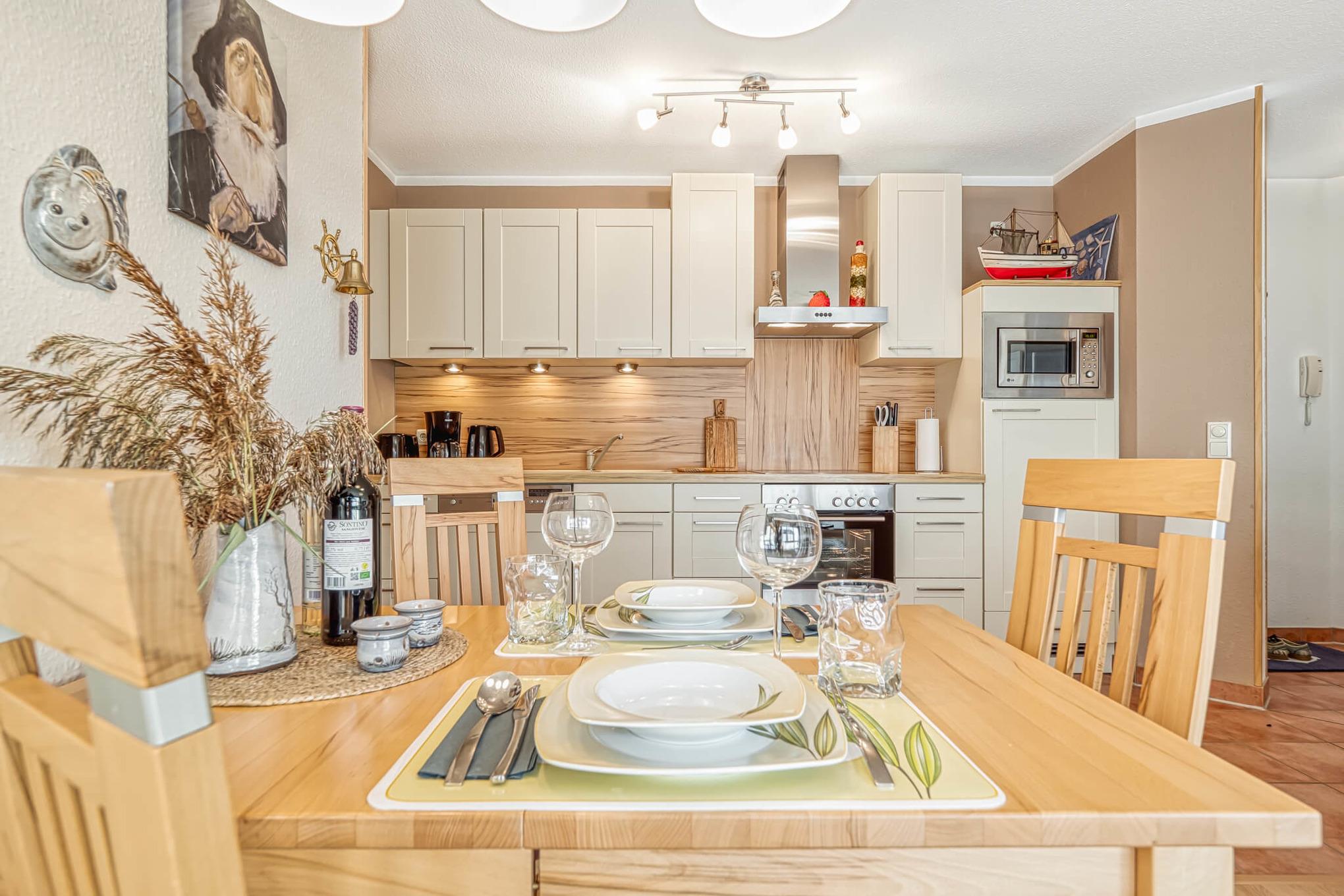 Die moderne Küche ist mit Kühlschrank/Gefrierfach, Herd mit Ceranfeld, Backofen, Geschirrspüler, Mikrowelle, Kaffeemaschine, Toaster und Wasserkocher komplettiert, also super für die Selbstversorgung. Einkaufsmöglichkeiten, Bäckereien und zahlreiche Restaurants finden Sie fußläufig in unmittelbarer Umgebung.