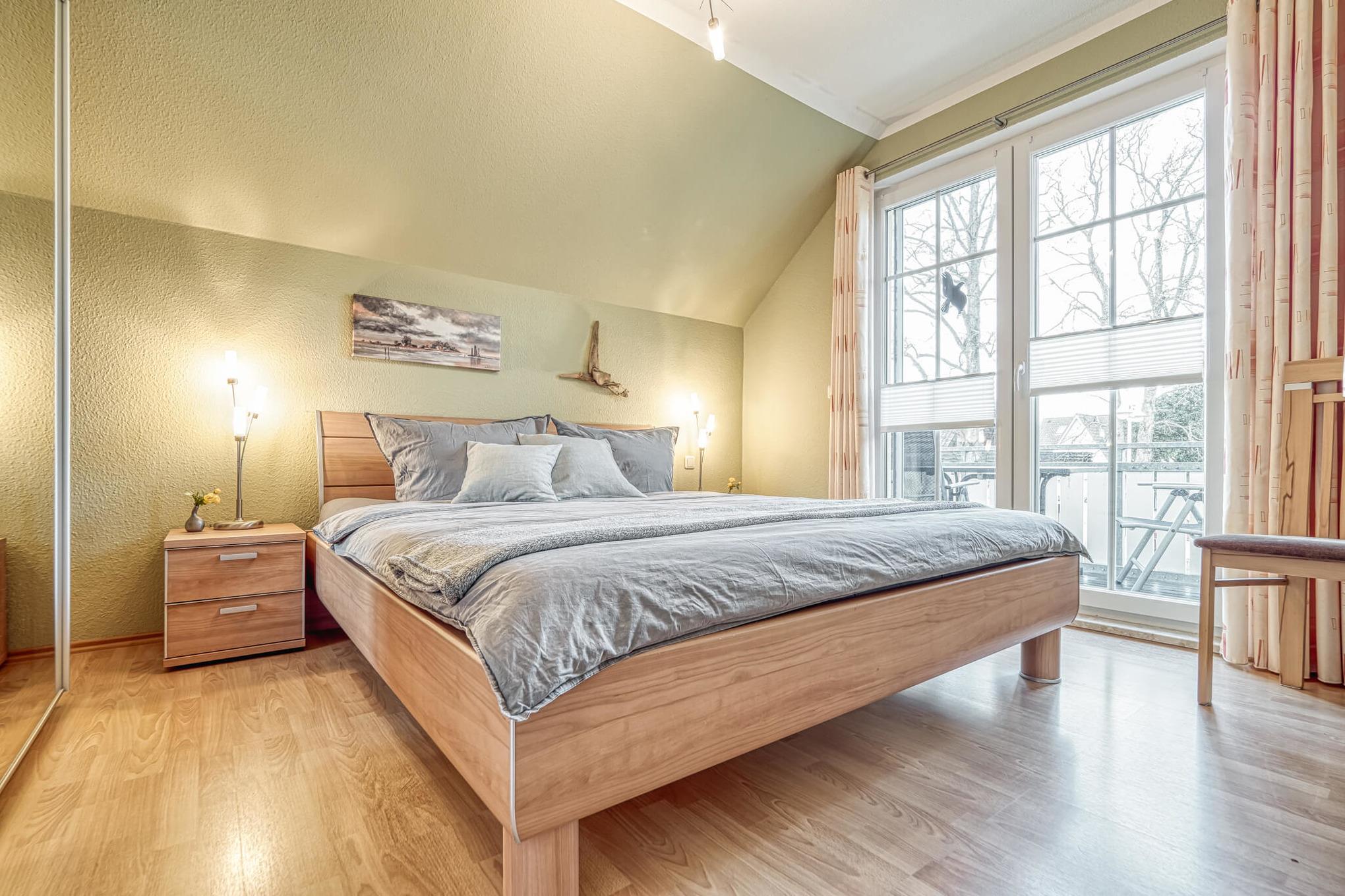 Zur Wohnung gehört ein Balkon mit Gartenmöbeln, der zum Entspannen einlädt. Ihr PKW Stellplatz befindet sich direkt am Haus, ebenso ein Fahrradabstellschuppen. Fahrräder und Bollerwagen können Sie im Ort von verschiedenen Anbietern ausleihen.