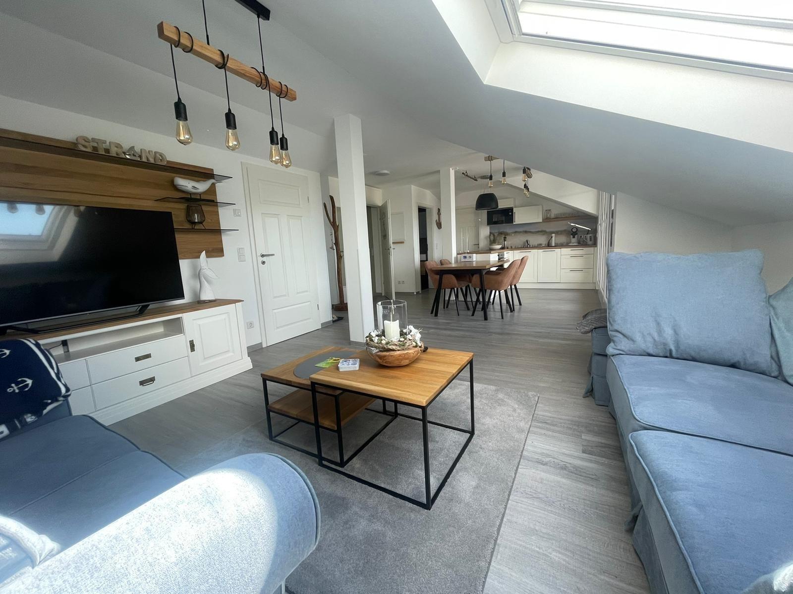 Direkt mit dem Fahrstuhl gelangen Sie in die moderne und liebevoll eingerichtete Ferienwohnung. Das helle und lichtdurchflutete Penthouse mit seinen ca. 75 m² verfügt über 2 Schlafzimmer, einen gemütlichen Wohnbereich mit offener Küche, einem modernen Bad und einem freundlichen Balkon. Außerdem stehen den Gästen zwei hauseigene Parkplätze sowie ein Fahrradabstellraum zur Verfügung.
