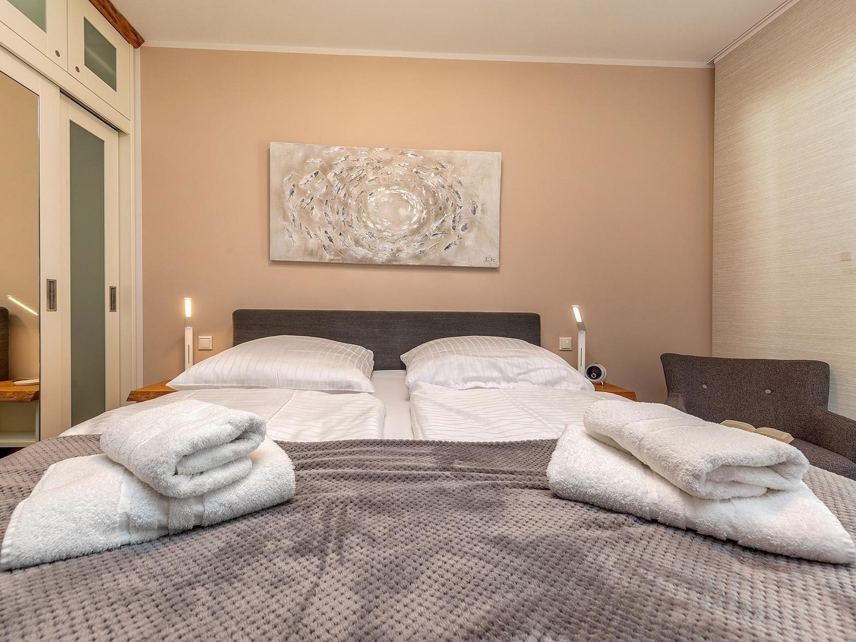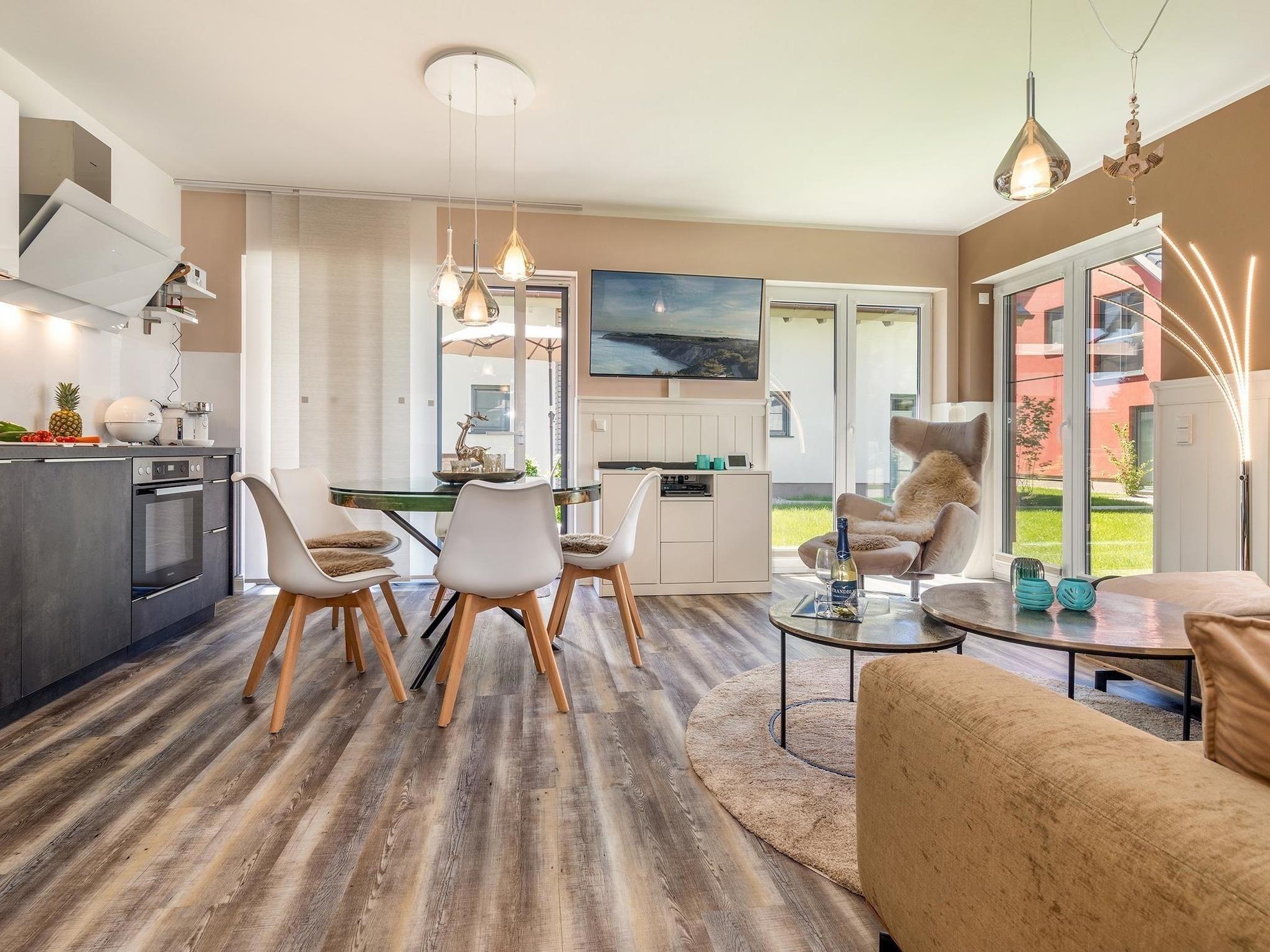 Die Ferienwohnung bietet ein modernes und komfortables Ambiente mit zwei Schlafzimmern, ausgestattet mit je einem Doppelbett, ideal für Familien oder Gruppen. Die offene Küche ist hochwertig eingerichtet und verfügt über einen Geschirrspüler, Elektro-/Gasherd, Backofen, Kühlschrank, Kaffeemaschine, Toaster sowie eine Gefriermöglichkeit. Ein gemütliches Sofa im Wohnbereich lädt zum Entspannen ein, während die Fußbodenheizung für angenehme Wärme sorgt.