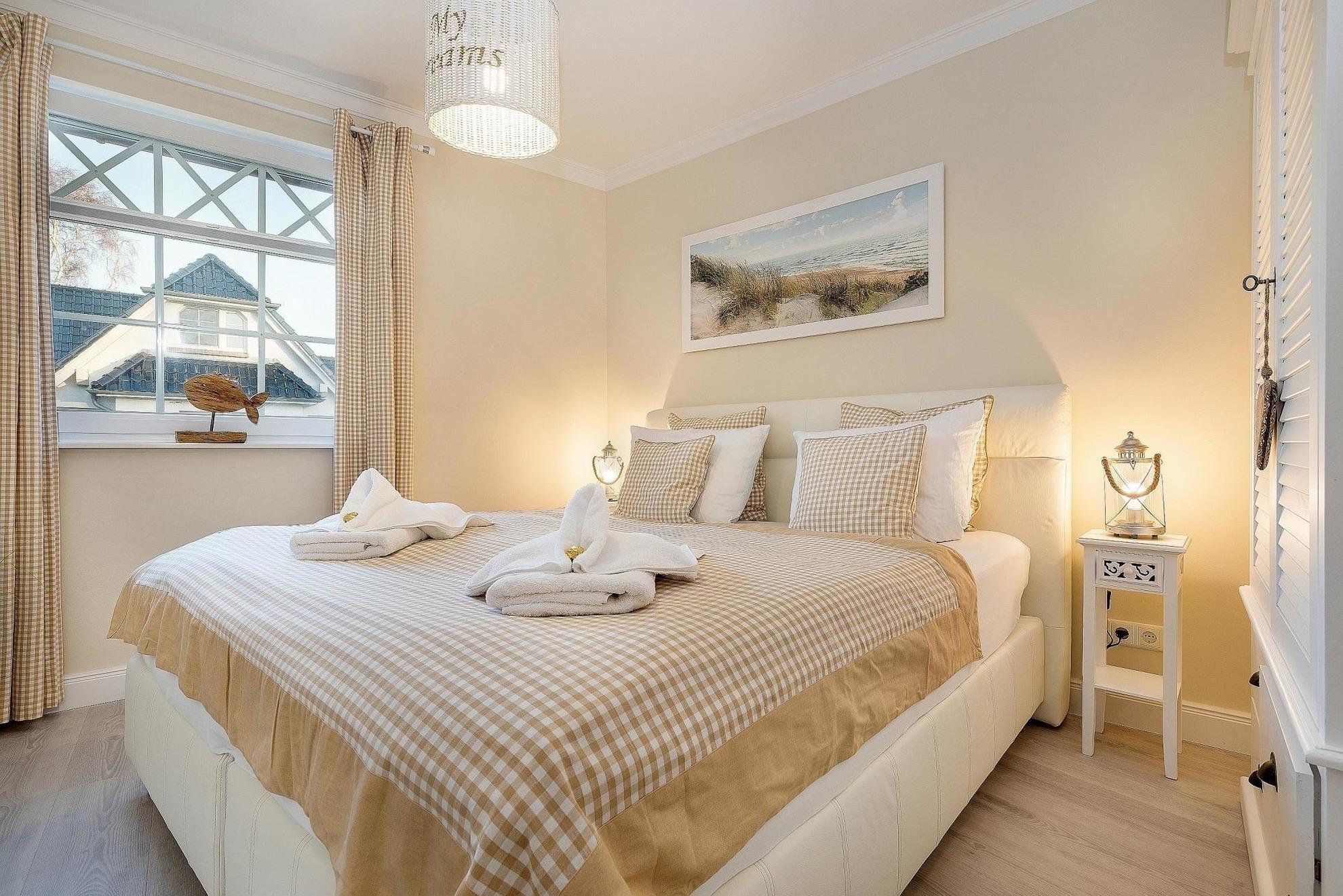 Die Ferienwohnung bietet eine durchdachte Raumaufteilung und hochwertige Ausstattung für einen angenehmen Aufenthalt. Zwei gemütliche Schlafzimmer sind mit bequemen Boxspringbetten (180x200) ausgestattet und verfügen über Flat-TVs sowie Kleiderschränke und Nachttische. Das Badezimmer überzeugt mit bodengleicher Dusche, Badewanne und einem großen Fenster. Zusätzliche Annehmlichkeiten wie Haartrockner und Kosmetikspiegel sind vorhanden.