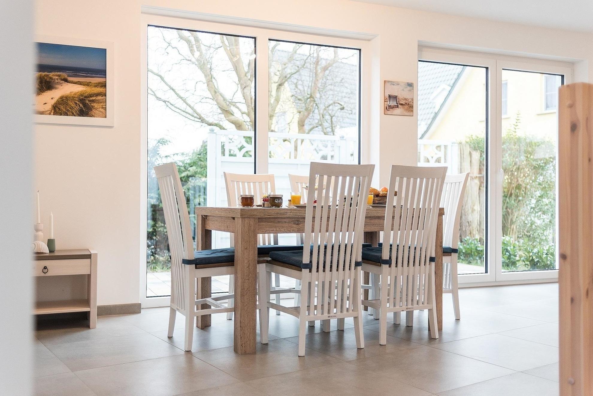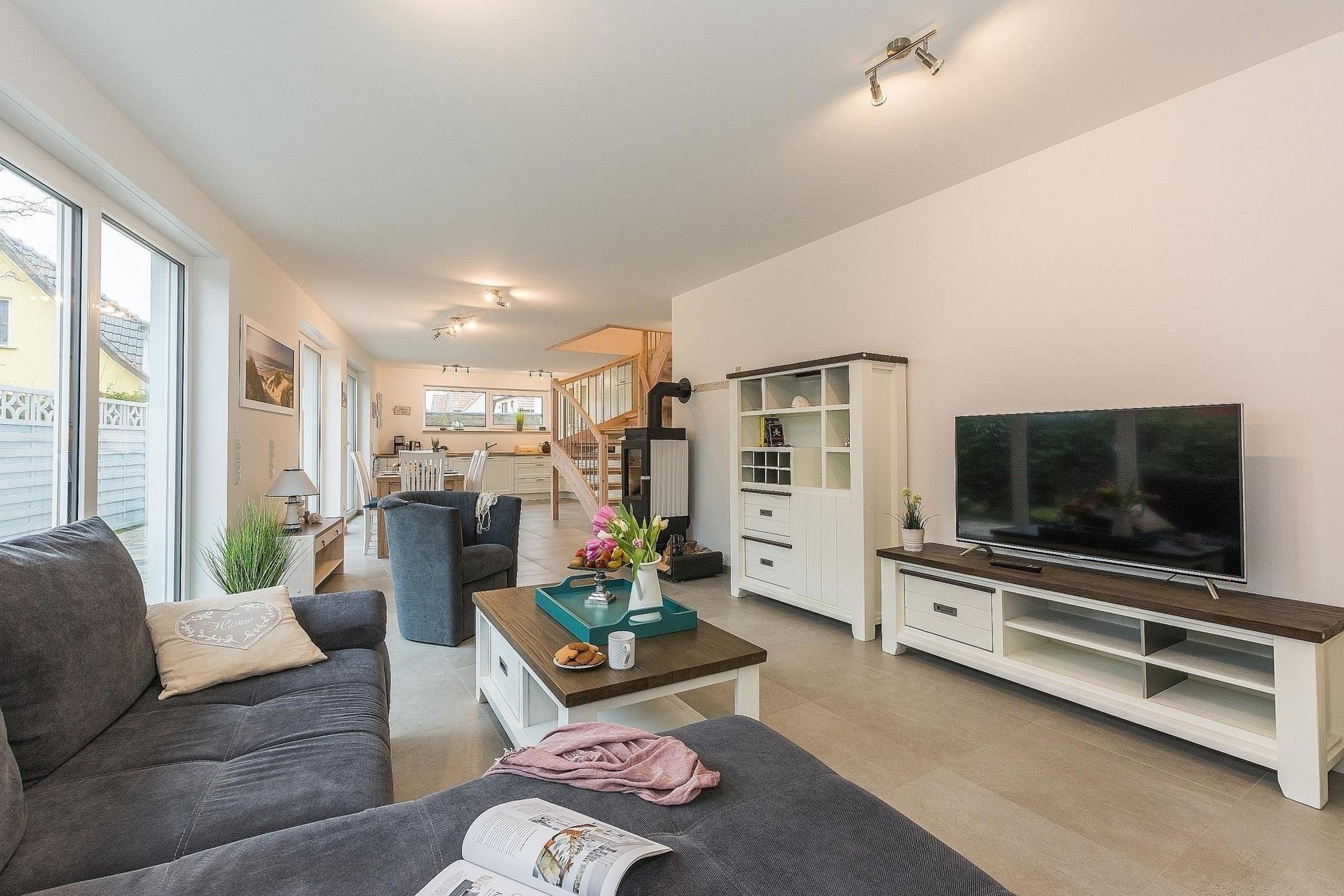 In der Lindenstraße erwartet die Gäste ein großzügiges Strandhaus, das ideal für erholsame Ferien ist. Das lichtdurchflutete Wohnzimmer mit Kamin schafft eine einladende Atmosphäre, während die große, moderne Küche mit Elektro-/Gasherd, Backofen, Geschirrspüler und einer Vielzahl von Küchenutensilien alle Kochwünsche erfüllt. Der angrenzende Essbereich bietet ausreichend Platz für gemeinsame Mahlzeiten.
