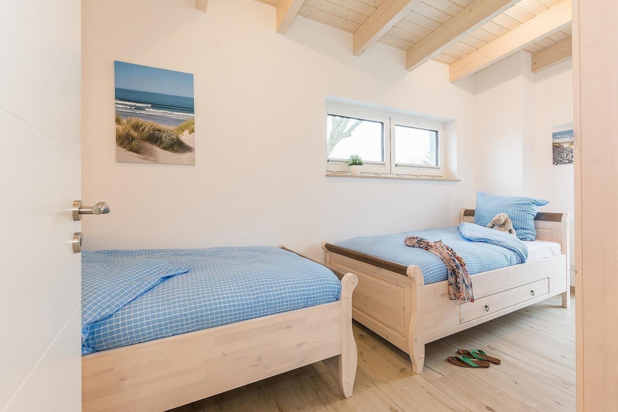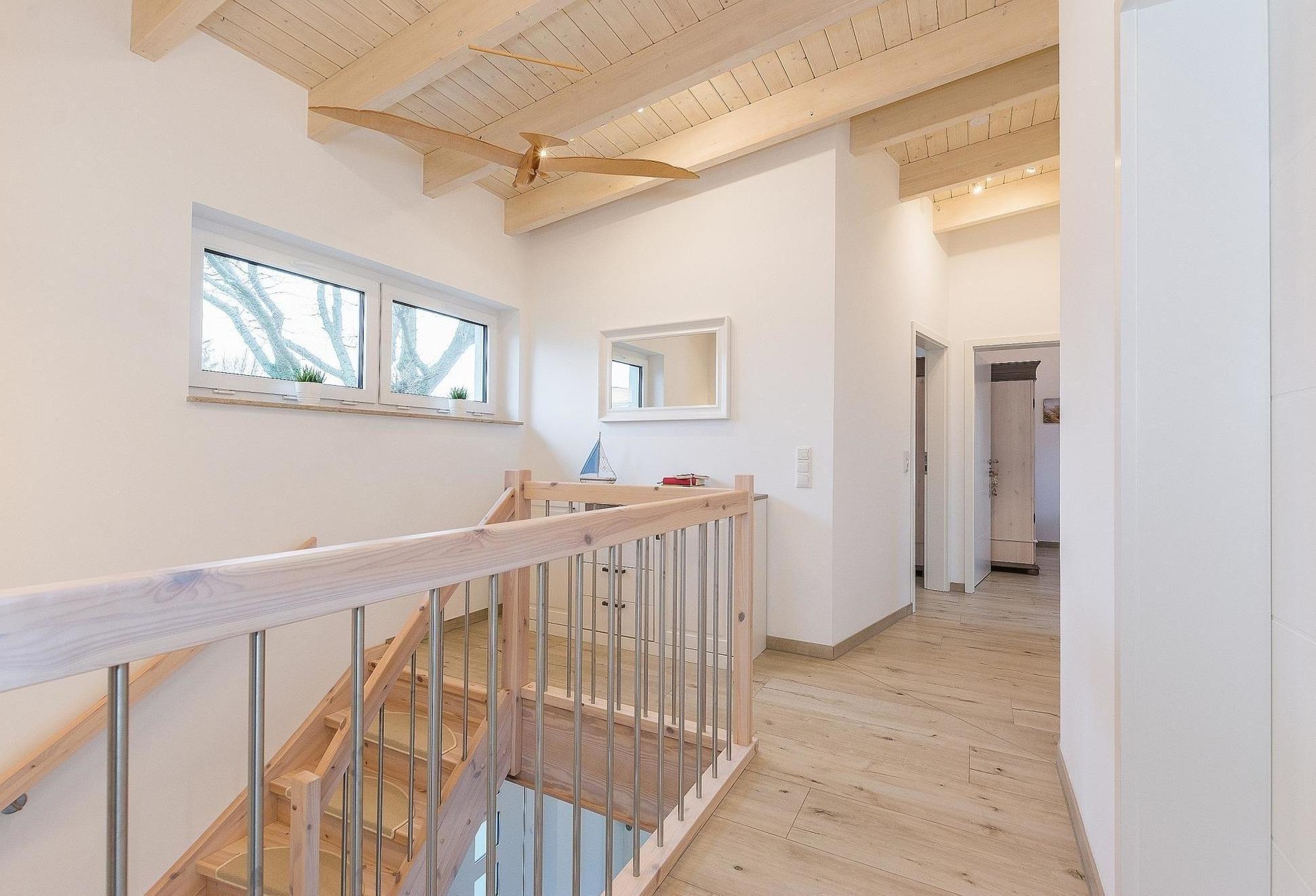 Im Obergeschoss befinden sich drei Schlafzimmer, darunter zwei mit komfortablen 180x200 cm Doppelbetten und ein Kinderzimmer mit zwei Einzelbetten. Zwei Badezimmer mit Fenstern sorgen für zusätzlichen Komfort. Zur Ausstattung gehören zudem WLAN, Fußbodenheizung, eine HiFi-Anlage, TV, und Brettspiele. Allergikerfreundliche Elemente, ein Parkplatz sowie eine Waschmaschine runden das Angebot ab. Das Haus ist ideal geeignet für einen entspannten Aufenthalt in der Natur.