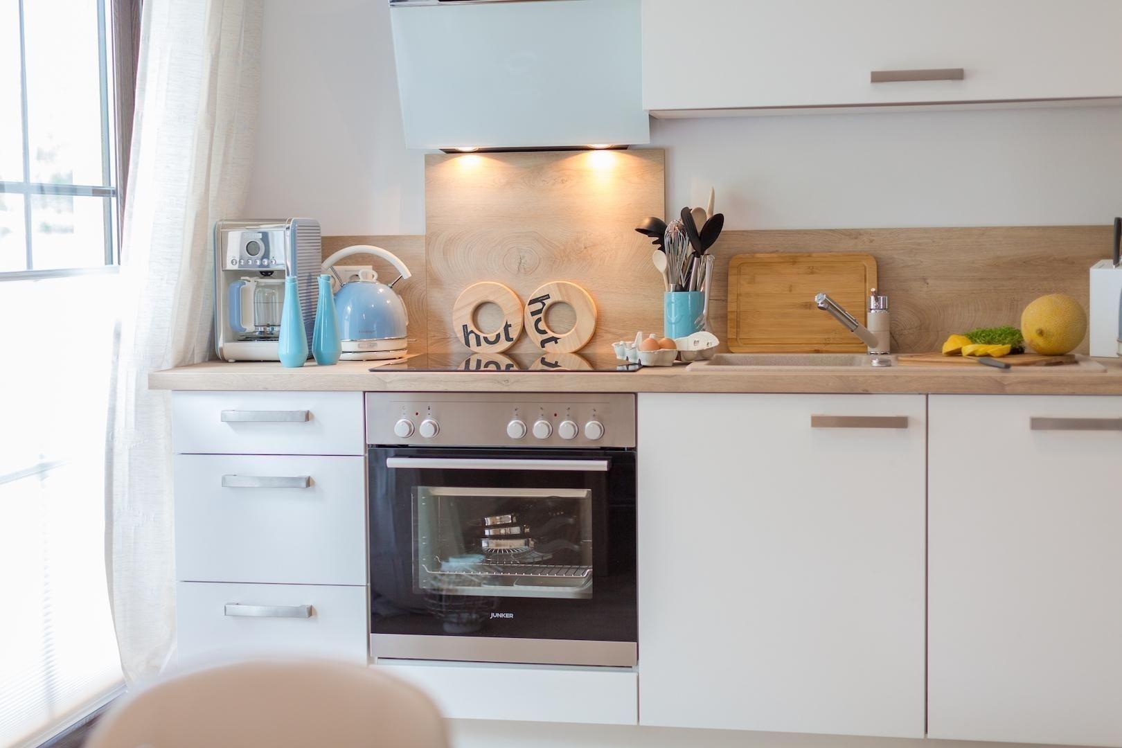 Die moderne Küche beinhaltet einen Elektro-/Gasherd, Backofen, Geschirrspüler, Mikrowelle sowie Kühlschrank und Gefriermöglichkeit. Kaffee kann mit der Kaffeemaschine oder dem Wasserkocher zubereitet werden. Der Esstisch ermöglicht gemütliche Mahlzeiten.