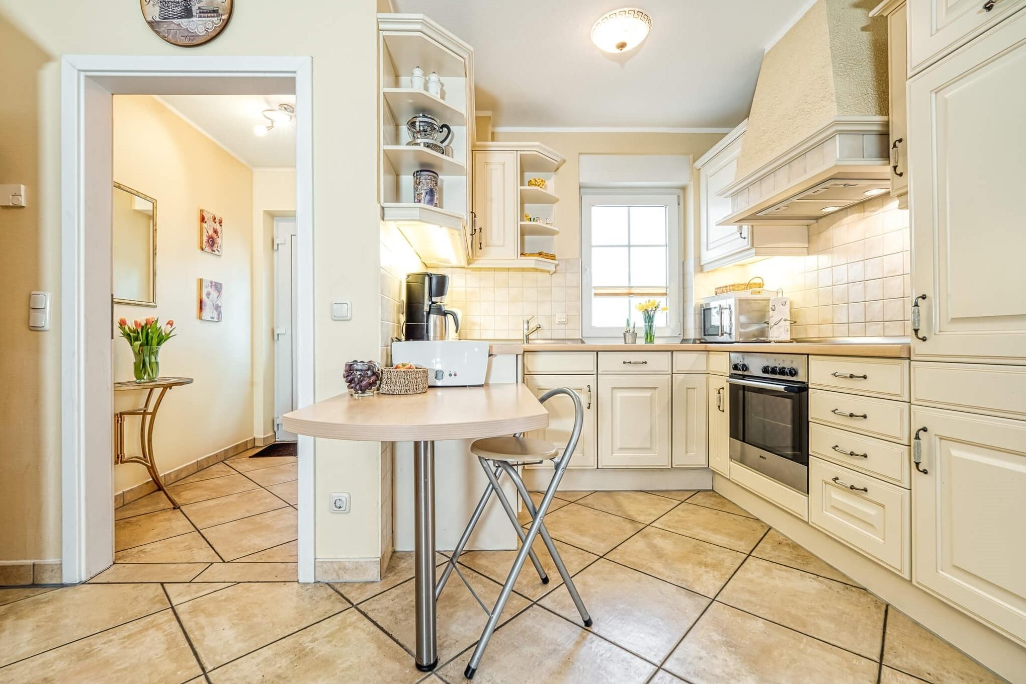 Über den separaten Eingang und Windfang mit Garderobe betreten Sie den Wohnbereich mit gemütlicher Sitzecke und Zugang zur Terrasse. Der große Wohnbereich umfasst auch den Essbereich und eine Küchenzeile mit Geschirrspüler, Kühlschrank mit Gefrierkombination und Backofen.